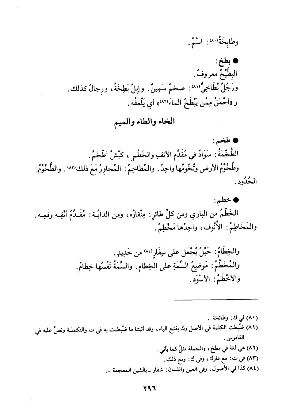 . طخم الطخْمَةُ : سَوَاد في مُقَدَم الأنفِ والخَطْم ، كَبْشٌ أطْخَمُ . وطخُوْمُ الأرض وتُخُومُها واحِدٌ . والمُطاخِمُ : المُجاوِرُ مَعَ ذلك والطُخُوْمُ : الحُدُود . خطم الخَطْمُ من البازي ومن كل طائر : مِنْقارُه ، ومن الدابًة : مُقَدمُ أنْفِه وفَمِه . والمَخَاطِم : الأنُوف ، واحِدُها مَخْطِم . والخِطَامُ : حَبْلٌ يُجْعَل على سِفَارٍ من حَدِيدٍ . والمُخَطَمُ : مَوضِعُ السًمَةِ على الخِطام . والسَمَةُ نَفْسُها خِطامٌ . والأخْطَمُ : الأسْود .