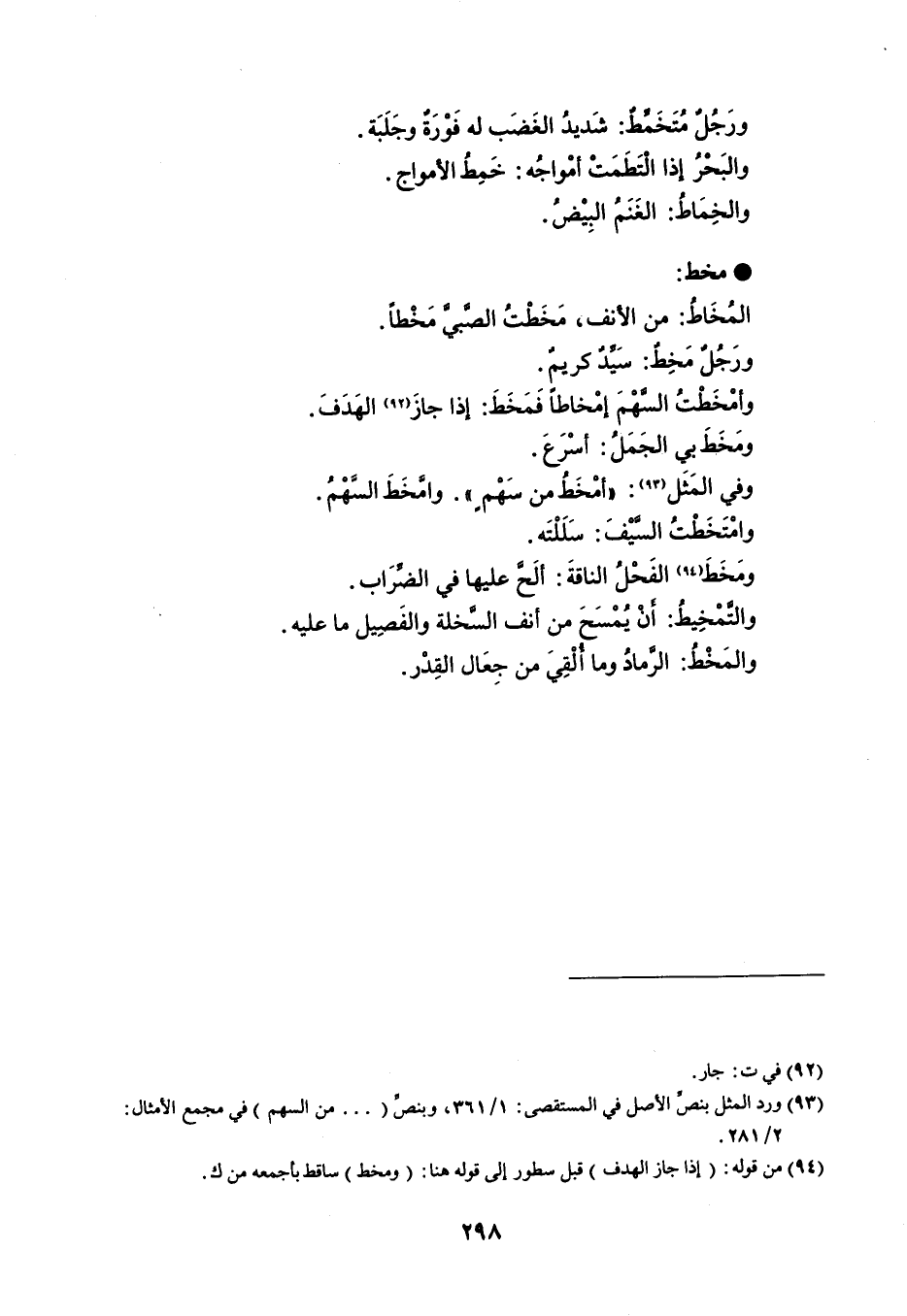 ورَجُل مُتَخَمط : شَديدُ الغَضَب له فَوْرَةٌ وجَلَبَة . والبَحْرُ إذا الْتَطَمَتْ أمْواجُه : خَمِطُ الأمواج . والخِمَاطُ الغَنَمُ البِيْضُ . مخط المخَاطُ : من الأنف ، مَخَطْتُ الصبي مَخْطاً . ورَجُل مَخِط : سَيدٌ كريمٌ . وأمْخَطْتُ السهْمَ إمْخاطاً فَمَخَطَ : إذا جازَ الهَدَفَ . ومَخَطَ بي الجَمَلُ : أسْرَعَ . وفي المَثَل : أمْخَطُ من سَهْم . وامَخَطَ السَهْمُ . وامْتَخَطْتُ السيْفَ : سَلَلْتَه . ومَخَطَ الفَحْلُ الناقةَ : ألَح عليها في الضِّرَاب . والتمْخِيطُ : أنْ يُمْسَحَ من أنف السخلة والفَصِيل ما عليه . والمَخْطُ : الرماد وما ألْقِيَ من جِعَال القِدْر .