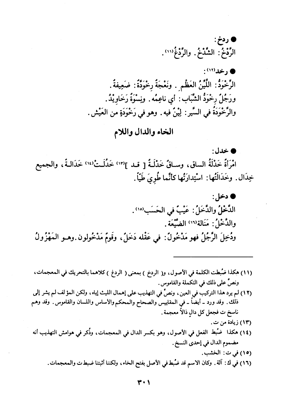 خدل امْرَأةٌ خَدْلَةُ الساق ، وساقٌ خَدْلَةٌ قد خَدُلَتْ خَدَالةً ، والجميع خِدَال . وخَدَالَتُها : اسْتِدارَتُها كأنما طُوِيَ طَيّاً . دخل الدَّخْلُ والدًخَلُ : عَيْبٌ في الحَسَب . والدخْلُ : مَنَالة الضًيْعَة . ودُخِلَ الرجُلُ فهو مَدْخُول : في عَقْله دَخَل ، وقَومٌ مَدْخُولون . وهو المَهْزُولُ