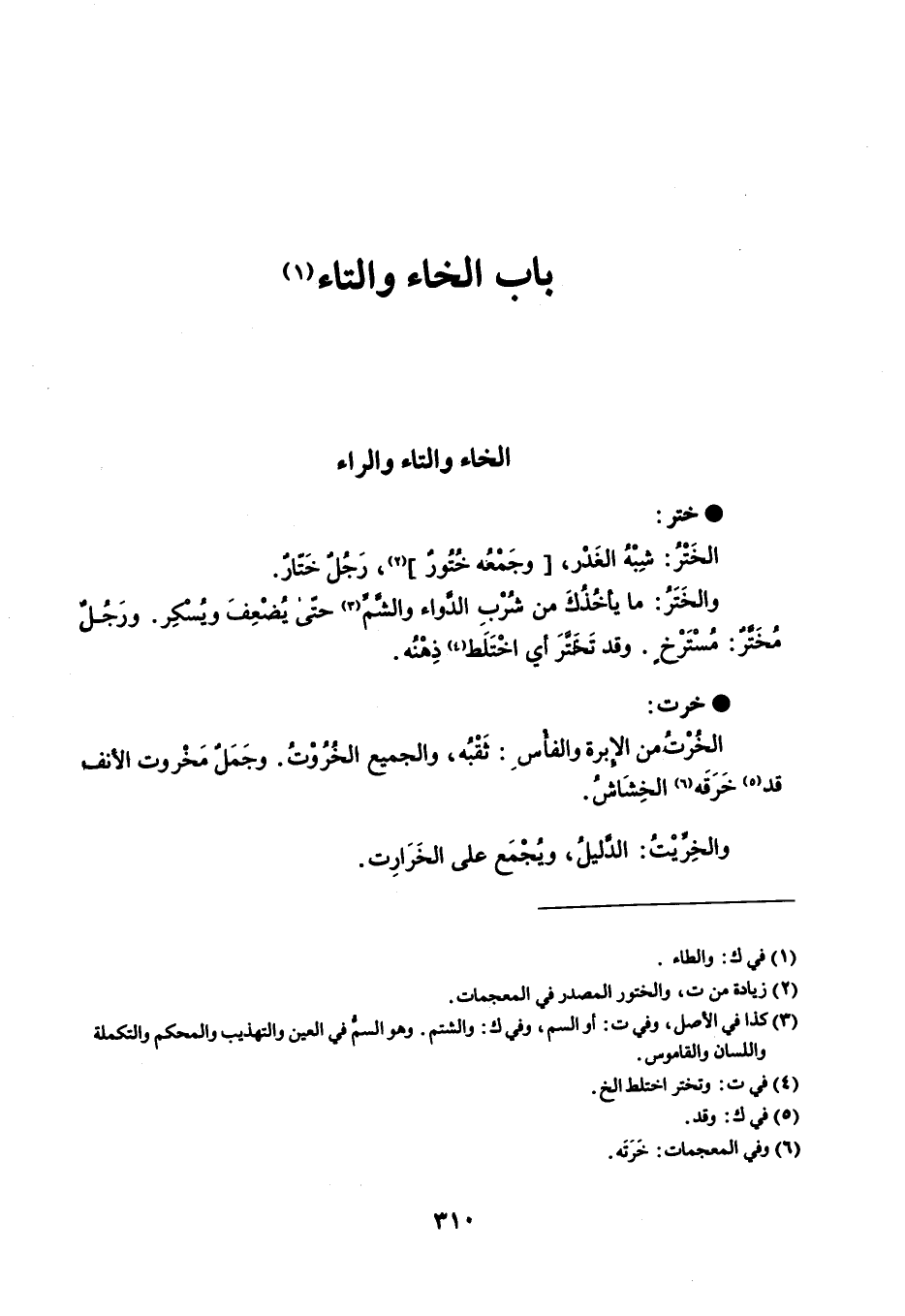 ختر الخترُ : شِبْهُ الغَدْر ، وجَمْعُه خُتُورَ ، رَجُل خَتار . والخَتَرُ : ما يأخُذكَ من شُربِ الدواء والشم حتى يُضْعِفَ ويُسكِر . ورَجُل مخَتر : مُسْتَرْخ . وقد تَخَترَ أي اخْتَلَط ذهْنُه . خرت الخُرْتُ من الإبرة والفأس : ثَقْبُه ، والجميع الخرُوتُ . وجَمَل مَخْروت الأنف قد خَرَقَه الخِشَاشُ . والخِريْت : الدليلُ ، ويُجمَع على الخَرَارِت .
