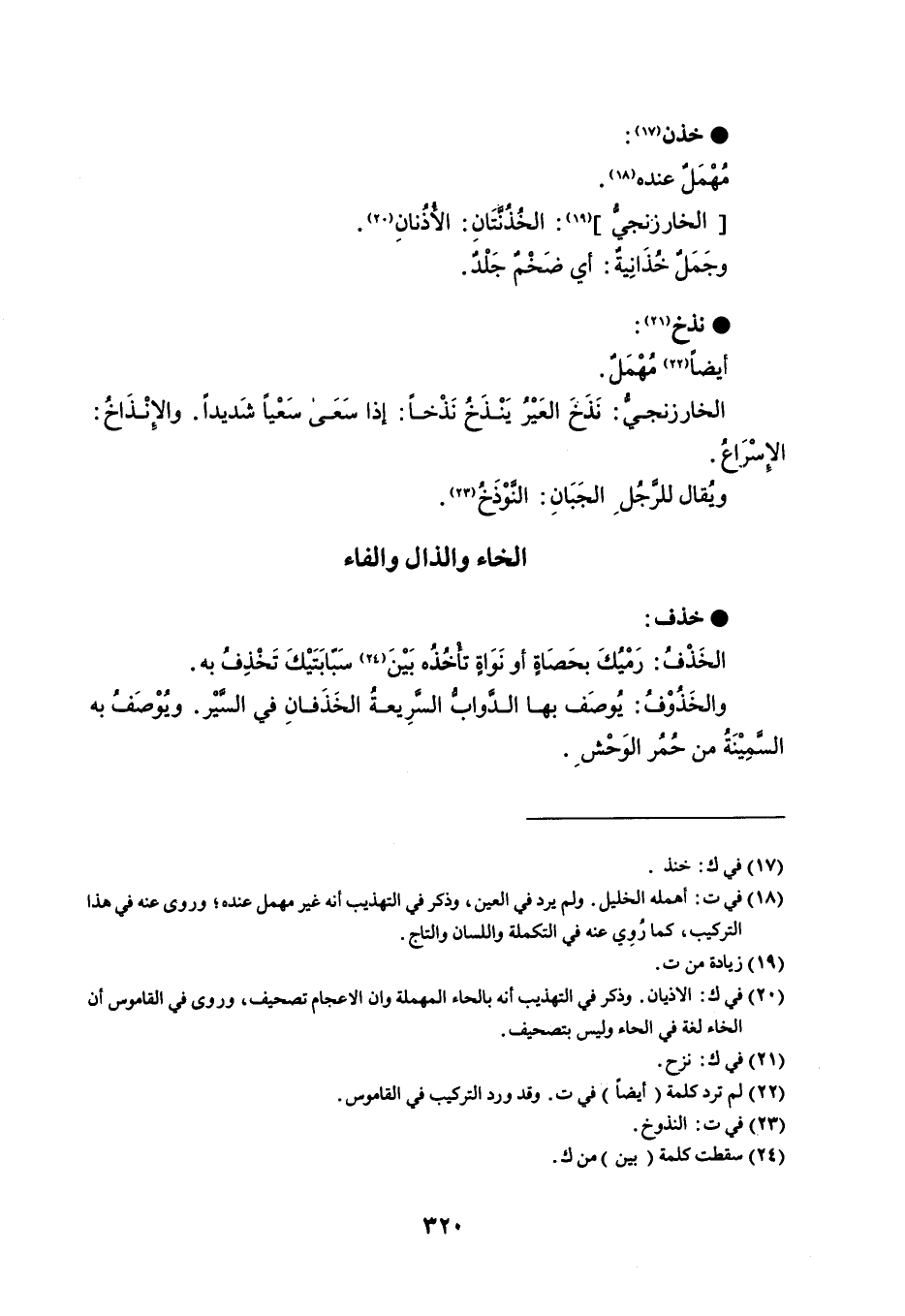 خذن مُهْمَلٌ عنده . الخارزْنجيُ : الخُذُنتَانِ : الأذُنانِ . وجَمَلٌ خُذَانِيةٌ : أي ضَخْمٌ جَلْد . نذخ أيضاً مُهْمَلٌ . الخارزنجي : نَذَخَ العَيْرُ يَنْذَخُ نَذْخاً : إذا سَعَى سَعْياً شَديداً . والإِنْذَاخُ الإِسْرَاعُ . ويُقال للرجُل الجَبَانِ : النَّوْذَخُ .