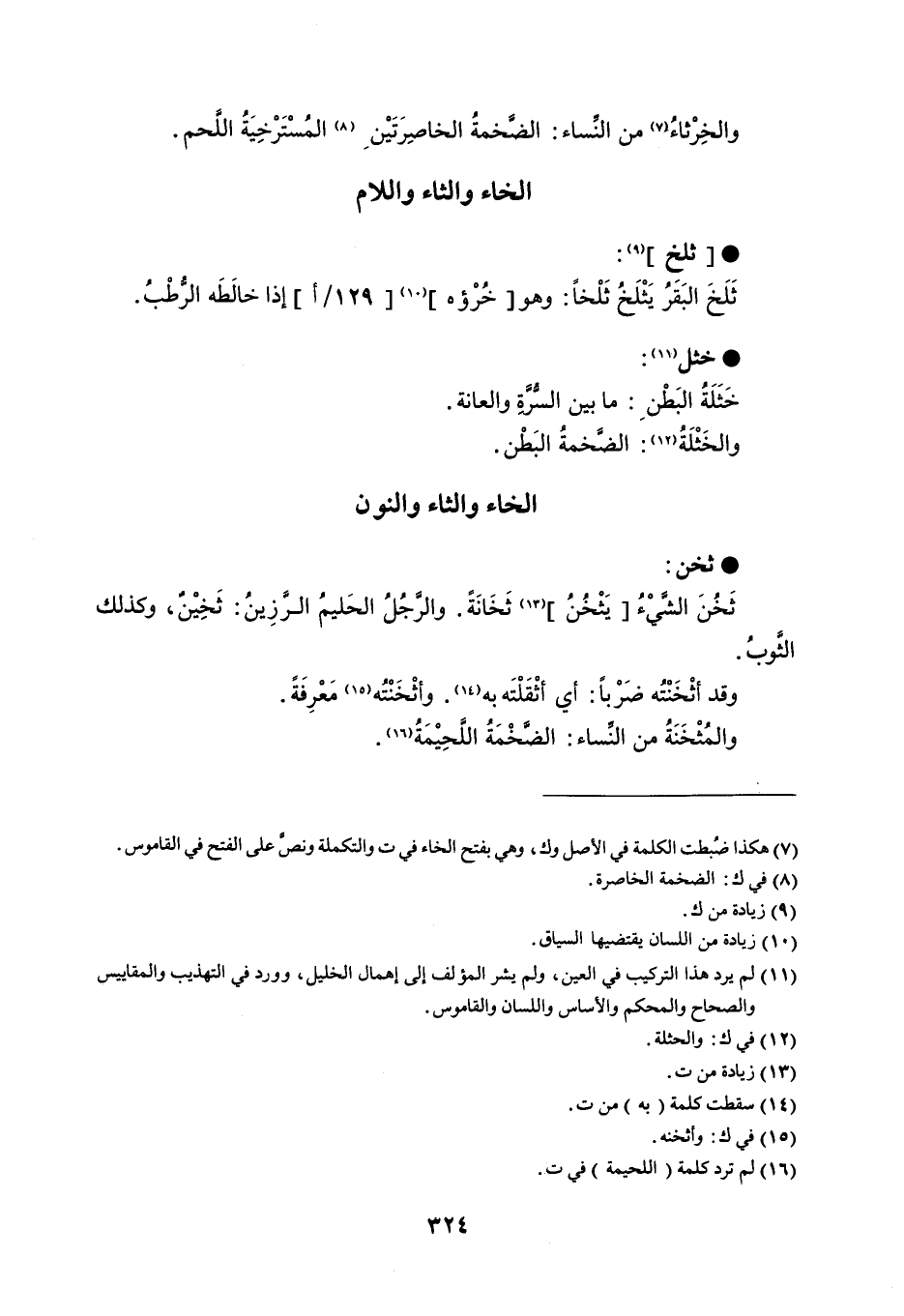 ثلخ ثَلَخَ البَقَرُ يَثْلَخُ ثَلْخاً : وهو خُرْؤه إذا خالَطَه الرُّطْبُ . خثل خَثَلَةُ البَطْن : ما بين السُّرَّةِ والعانة . والخَثْلَةُ : الضَّخمةُ البَطْن .