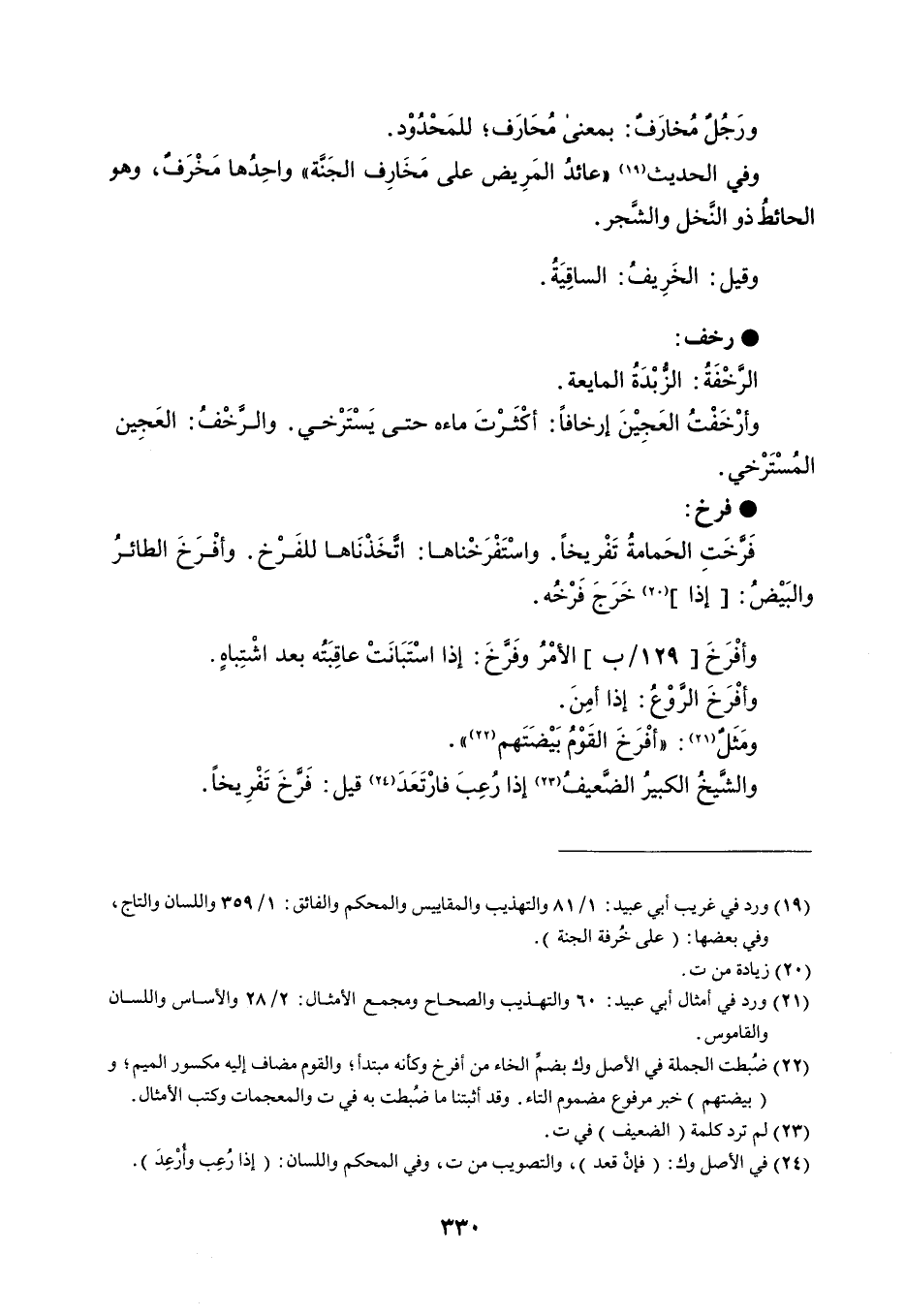 ورَجُلٌ مُخارَفٌ : بمعنى مُحَارَف ؛ للمَحْدُوْد . وفي الحديث ' عائدُ المَرِيض على مَخَارِف الجَنة ' واحِدُها مَخْرَفٌ ، وهو الحائطُ ذو النَّخل والشَجر . وقيل : الخَرِيفُ : الساقِيَةُ . رخف الرخْفَةُ : الزُبْدَةُ المايعة . وأرْخَفْتُ العَجِيْنَ إرخافاً : أكْثَرْتَ ماءه حتى يَسْتَرْخي . والرَّخْفُ : العَجِين المسْتَرْخي . فرخ فَرخَتِ الحَمامةُ تفريخاً . واسْتَفْرَخْناها : اتخَذْنَاها للفَرْخ . وأفْرَخَ الطائرُ والبَيْضُ : إذا خَرَج فَرْخُه . وأفْرَخَ الأمْرُ وفَرخ : إذا اسْتَبَانَتْ عاقِبَتُه بعد اشْتِباهٍ . وأفْرَخ الرَّوْعُ : إذا أمِنَ . ومَثَلٌ : أفْرَخَ القَوْم بَيْضَتَهم . والشًيخُ الكبيرُ الضَّعيفُ إذا رُعِبَ فارْتَعَدَ قيل : فَرَّخَ تَفْرِيخاً .