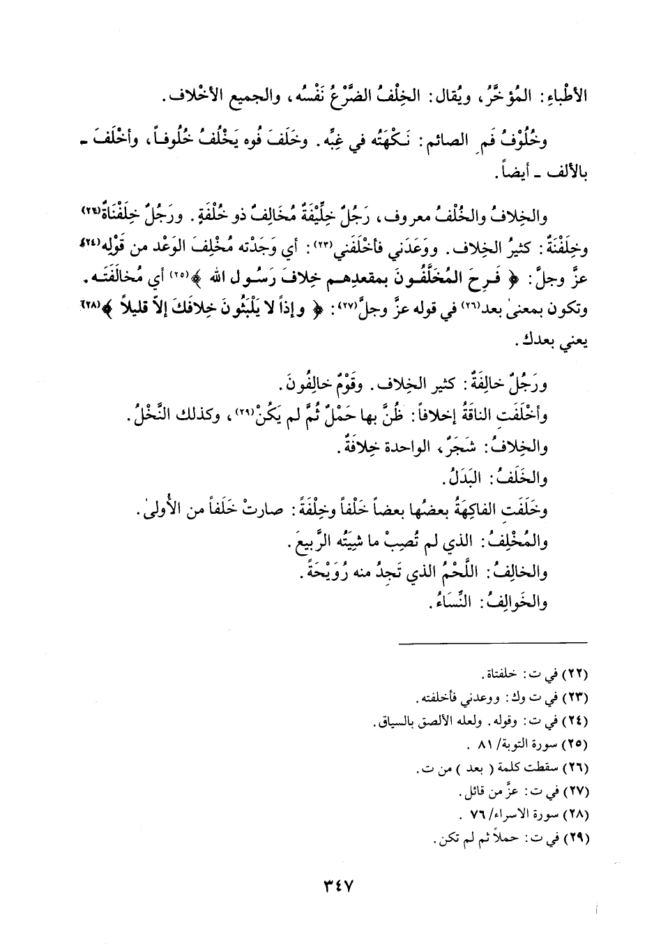 الأطْباءِ : المُؤخَّرُ ، ويُقال : الخِلْفُ الضرْعُ نَفْسُه ، والجميع الأخْلاف . وخُلُوْفُ فَم الصائم : نَكْهَتُه في غِبه . وخَلَفَ فُوه يَخْلُفُ خُلُوفاً ، وأخْلَفَ - بالأنف - أيضاً . والخِلافُ والخُلْفُ معروف ، رَجُل خِلَيْفَةٌ مُخَالف ذو خُلْفَةٍ . ورَجُلٌ خِلَفْنَاة وخِلَفْنَة : كثيرُ الخِلاف . ووَعَدَني فأخْلَفَني : أي وَجَدْته مُخْلِفَ الوَعْد من قَوْله عزَ وجلَّ : ' فَرِحَ المُخَلَفُونَ بمقعدِهم خِلافَ رَسُول اللّه ' ' 25 ' أي مُخالَفَتَه . وتكون بمعنى بعد في قوله عزَ وجل : ' وإذاً لا يَلْبَثُونَ خِلافَكَ إلاّ قليلاً ' ' 28 ' يعني بعدك . ورَجلٌ خالِفَةٌ : كثير الخِلاف . وقَوْمٌ خالِفُونَ . وأخْلَفَتِ الناقَةُ إخلافاً : ظُنَّ بها حَمْلٌ ثُمَّ لم يَكنْ ، وكذلك النَخْلُ . والخِلاف : شَجَرٌ ، الواحدة خِلافَة . والخَلَفُ : البَدَلُ . وخَلَفَتِ الفاكِهَةُ بعضُها بعضاً خَلْفاً وخِلْفَةً : صارتْ خَلَفَاً من الأولى . والمُخْلِفُ : الذي لم تُصِبْ ما شِيَتُه الربِيعَ . والخالِفُ : اللَحْمُ الذي تَجِدً منه رُوَيْحَةَ . والخَوالِفُ : النِّسَاءُ .