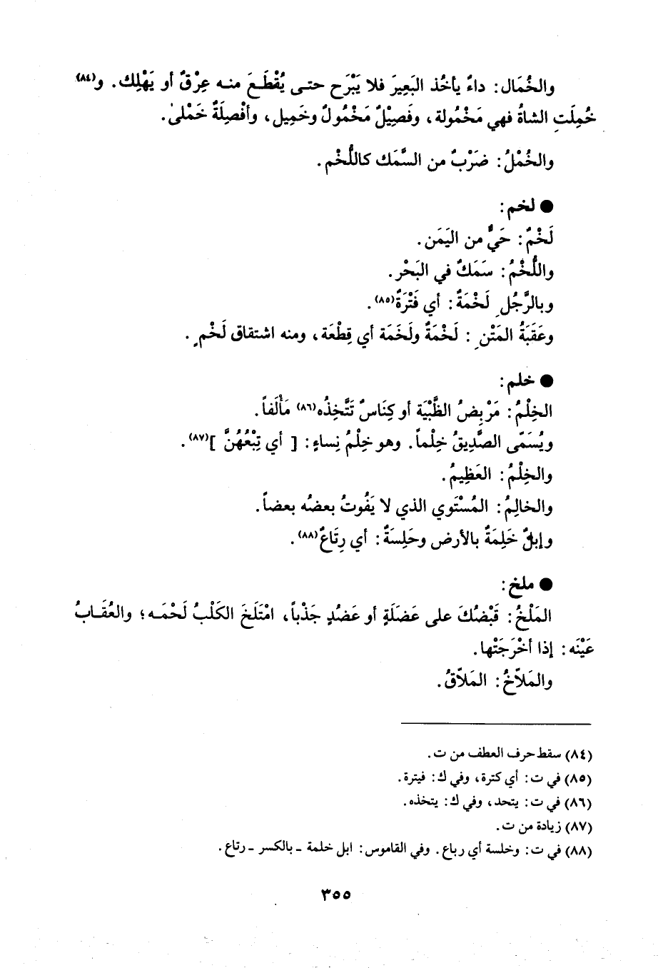 والخُمَال : داء يأخُذ البَعِيرَ فلا يَبرَح حتى يُطعَ منه عِرق أو يَهلِك . وخُمِلَتِ الشاةُ فهي مَخْمُولة ، وفَصِيل مَخْمُول وخَمِيل ، وأفْصِلَة خَملى . والخُمْلُ : ضَرْب من السمَك كاللخْم . لخم لَخْم : حَي من اليَمَن . واللخْمُ : سَمَكٌ فى البَحْر . وبالرجُل لَخْمَة : أي فَتْرَة . وعَقَبَةُ المَتْن : لَخْمَةٌ ولَخَمَة أي قِطْعَة ، ومنه اشتقاق لَخْم . خلم الخِلْمُ : مَرْبِضُ الظبْيَة أو كِنَاس تَتخِذُه مَألَفاً . ويُسمى الصدِيقُ خِلْماً . وهو خِلْمُ نِساءٍ : أي تِبْعُهُن . والخِلم : العَظِيمُ . والخالِمُ : المُسْتَوي الذي لا يَفُوتُ بعضُه بعضاً . وإبل خَلِمَةٌ بالأرض وحَلِسَةٌ : أي رِتَاعٌ . ملخ المَلْخُ : قَبْضُكَ على عَضَلَةٍ أو عَضد جَذْباً ، امْتَلَخَ الكَلْبُ لَحْمَه ؛ والعُقَابُ عَيْنَه : إذا أخْرَجَتْها . والمَلاّخُ : المَلاّقُ .