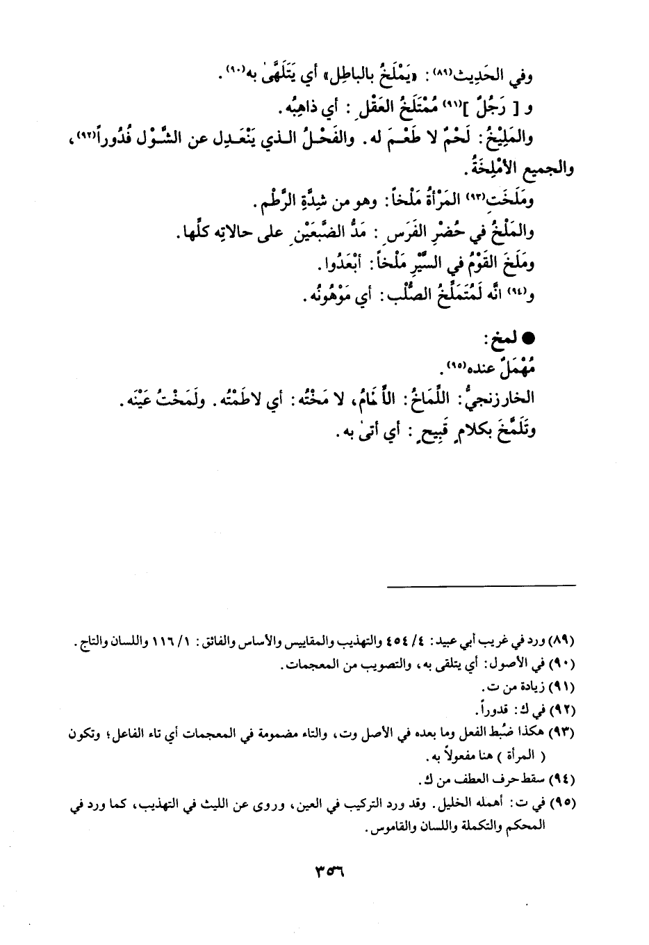 وفي الحَدِيث : ' يَمْلَخُ بالباطِل ' أي يَتَلهَى به . ورَجُل مُمتَلَخُ العَقْل : أي ذاهِبُه . والمَلِيْخُ : لَحْمَ لا طَعمَ له . والفَحْلُ الذي يَنْعَدِل عن الشول فُدُوراً ، والجميع الأملِخَةُ . ومَلَخَتِ المَرْأةُ مَلْخاً : وهو من شدةِ الرطْم . والمَلْخُ في حُضْرِ الفَرَس : مَد الضَبعَيْن على حالاتِه كلها . ومَلَخَ القَوْمُ في السيْرِ مَلْخاً : أبْعَدُوا . وأنه لَمُتَملخُ الصلْب : أي مَوْهُونُه . لمخ مُهمَل عنده . الخارزنجي : اللمَاخُ : اللمَام ، لا مَخْتُه : أي لاطَمْتُه . ولَمَخْتُ عَيْنَه . وتَلمخَ بكلام قَبِيح : أي أتى به .
