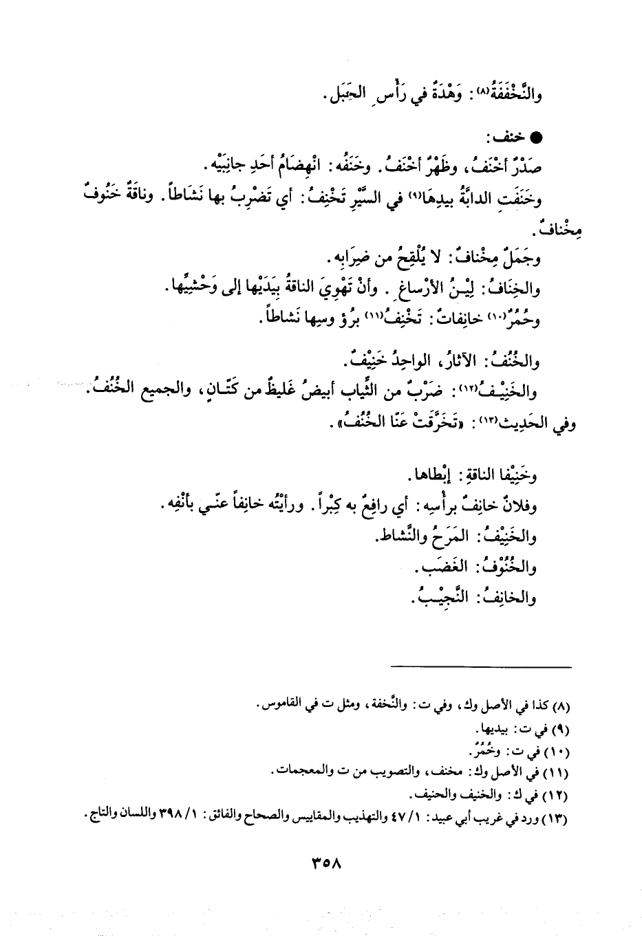 والنَخْفَفَةُ : وَهْدَةٌ في رَأس الحَبَل . خنف صَدْرٌ أخْنَفُ ، وظَهْرٌ أخْنَفُ . وخَنَفُه : انْهِضَامُ أحَدِ جانِبَيْه . وخَنَفَتِ الدابةُ بيدِهَا في السَيْرِ تَخْنِفُ : أي تَضْرِبُ بها نَشَاطاً . وناقَةٌ خَنُوفٌ مخْناف . وجَمَل مِخْنافٌ : لا يُلْقِحُ من ضِرَابِه . والخِنَافُ : لِيْنُ الأرْساغ . وأنْ تَهْوِيَ الناقةُ بِيَدَيْها إلى وَحْشيها . وحُمُرٌ خانِفاتٌ : تَخْنِفُ برُؤوسِها نَشاطاً . والخُنُفُ : الآثار ، الواحِدُ خَنِيْفٌ . والخَنِيْفُ : ضَرْبٌ من الثِّياب أبيضُ غَليظُ من كَتّانٍ ، والجميع الخُنُفُ . وفي الحَدِيث : ' تَخَرَّقَتْ عَنّا الخُنُفُ ' . وخَنِيْفا الناقةِ : إبْطاها . وفلانٌ خانِفٌ برأسِه : أي رافِع به كِبْراً . ورأيْتُه خانِفاً عنّي بأنْفِه . والخَنِيْفُ : المَرَحُ والنَشاط . والخُنُوْفُ : الغَضَب . والخانِفُ : النَجِيْبُ .