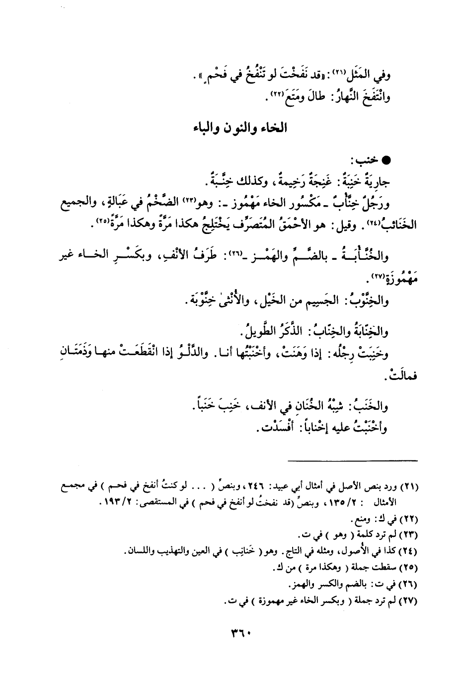 خنب جارِيَةٌ خَنِبَةٌ : غَنِجَة رَخِيمة ، وكذلك خِنبَةٌ . ورَجُل خِنابٌ - مَكْسًور الخاء مَهْمُوز - : وهو الضَّخْمُ في عَبَالة ، والجميع الخَنَائبُ . وقيل : هو الأحْمَقُ المُتَصَرِّف يَخْتَلِجُ هكذا مَرَّةً وهكذا مَرة . والخُنأبَةُ - بالضَّمَ والهَمْز - : طَرَفُ الأنْفِ ، وبكَسْرِ الخاء غير مَهْمُوزة . والخِنَّوْبُ : الجَسِيم من الخَيْل ، والأنْثى خِنَوْبَة . والخِنّابَةُ والخِنّابُ : الذكَرُ الطَويلُ . وخَنِبَتْ رِجْلُه : إذا وَهَنَتْ ، وأخْنَبْتُها أنا . والدَّلْوُ إذا انْقَطَعَتْ منها وَ ذَمَتَانِ فمالَتْ . والخَنَبُ : شِبْهُ الخُنَانِ في الأنف ، خَنِبَ خَنَباً . وأخْنَبْتُ عليه إخْناباً : أفْسَدْت .