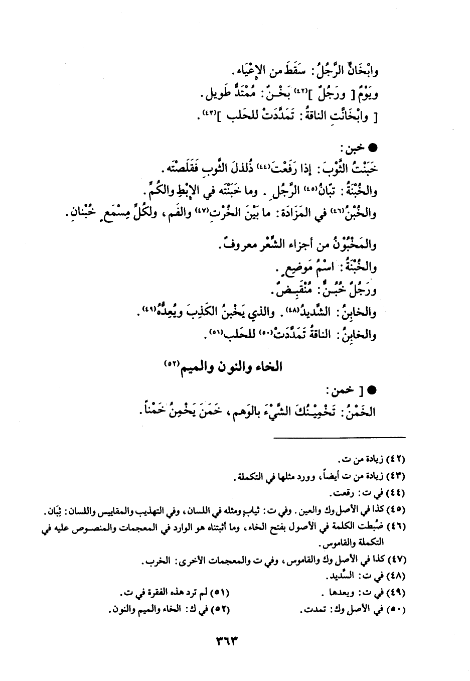 وابْخَانَّ الرَّجُلُ : سَقَطَ من الإِعْيَاء . ويَوْمٌ ورَجُلٌ بَخْنٌ : مُمْتَدٌّ طَويل . وابْخَانَّتِ الناقةُ : تَمَدَّدَتْ للحَلب . خبن خَبَنتُ الثَّوْبَ : إذا رَفَعْتَ ذُلذلَ الثَّوبِ فَقَلَصْتَه . والخُبْنَةُ : تبّانُ الرَّجُلِ . وما خَبَنْتَه في الإِبْطِ والكُمِّ . والخبْنُ في المَزَادَة : ما بَيْنَ الخُرْتِ والفَم ، ولكُل مِسْمَعٍ خُبْنانِ . والمَخْبُوْنُ من أجزاء الشِّعْر معروفٌ . والخُنْبَةُ : اسم مَوضِعٍ . ورَجُلٌ خُبُنٌّ : مُنْقَبِضٌ . والخابِنُ : الشَّديدُ . والذي يَخْبنُ الكَذِبَ ويُعِدُّهُ . والخابِنُ : الناقة تَمدَّدَتْ للحَلب .
