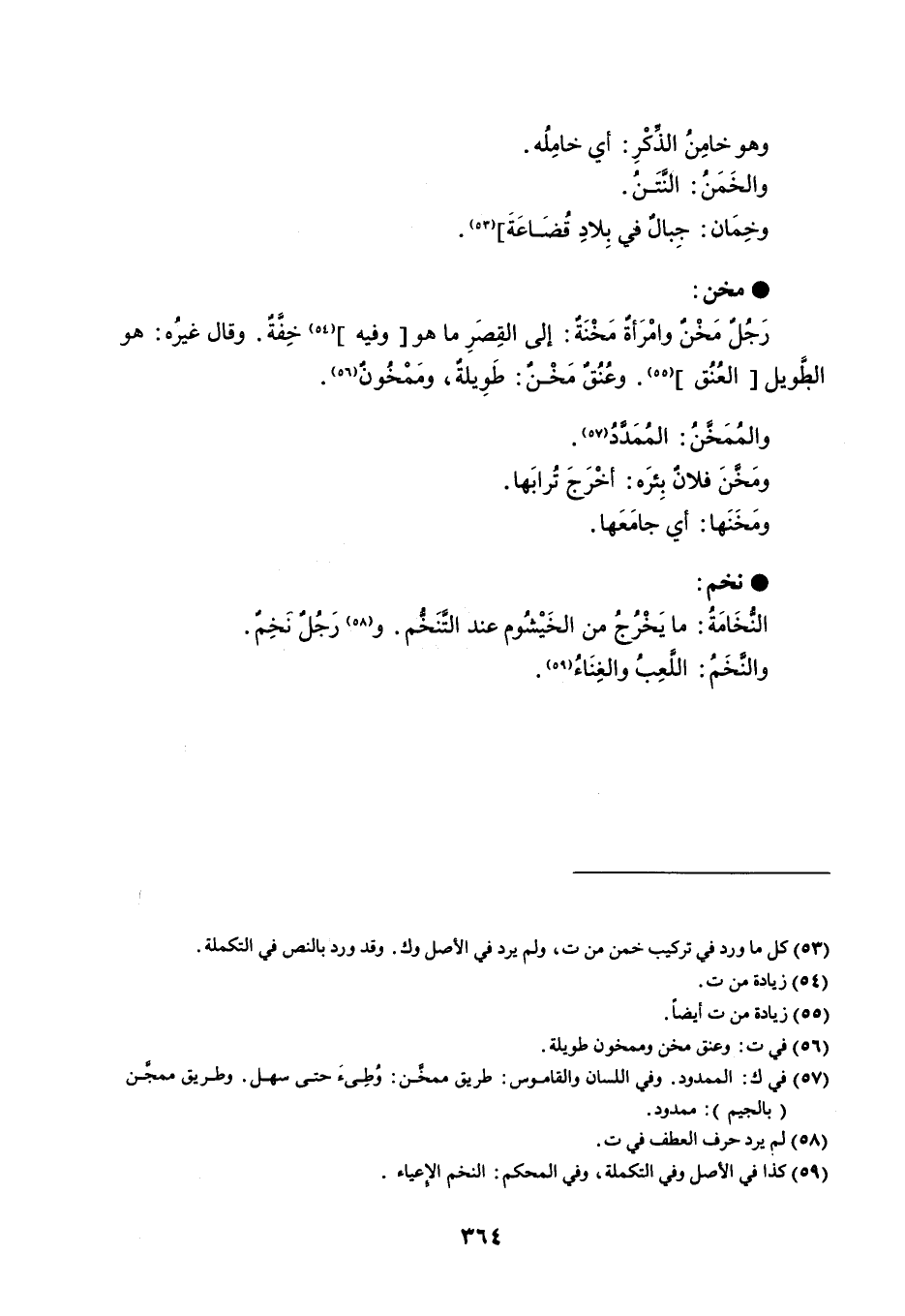 وهو خامِنُ الذِّكْرِ : أي خامِلُه . والخَمَنُ : النَّتَنُ . وخِمَان : جِبالٌ في بِلادِ قُضَاعَةَ . مخن رَجُلٌ مَخْنٌ وامْرَأةٌ مَخْنَةٌ : إلى القِصَرِ ما هو وفيه خِفَّةٌ . وقال غيرُه : هو الطويل العُنُق . وعُنُقٌ مَخْنٌ : طَوِيلةٌ ، ومَمْخُونٌ . والمُمَخَّنُ : المُمَدَّدُ . ومَخَّنَ فلان بِئرَه : أخْرَجَ تُرابَها . ومَخَنَها : أي جامَعَها . نخم النُّخَامَةُ : ما يَخْرُجُ من الخَيْشُوم عند التَّنَخُّم . ورَجُلٌ نخِمٌ . والنَّخَمُ : اللَّعِبُ والغِنَاءُ .