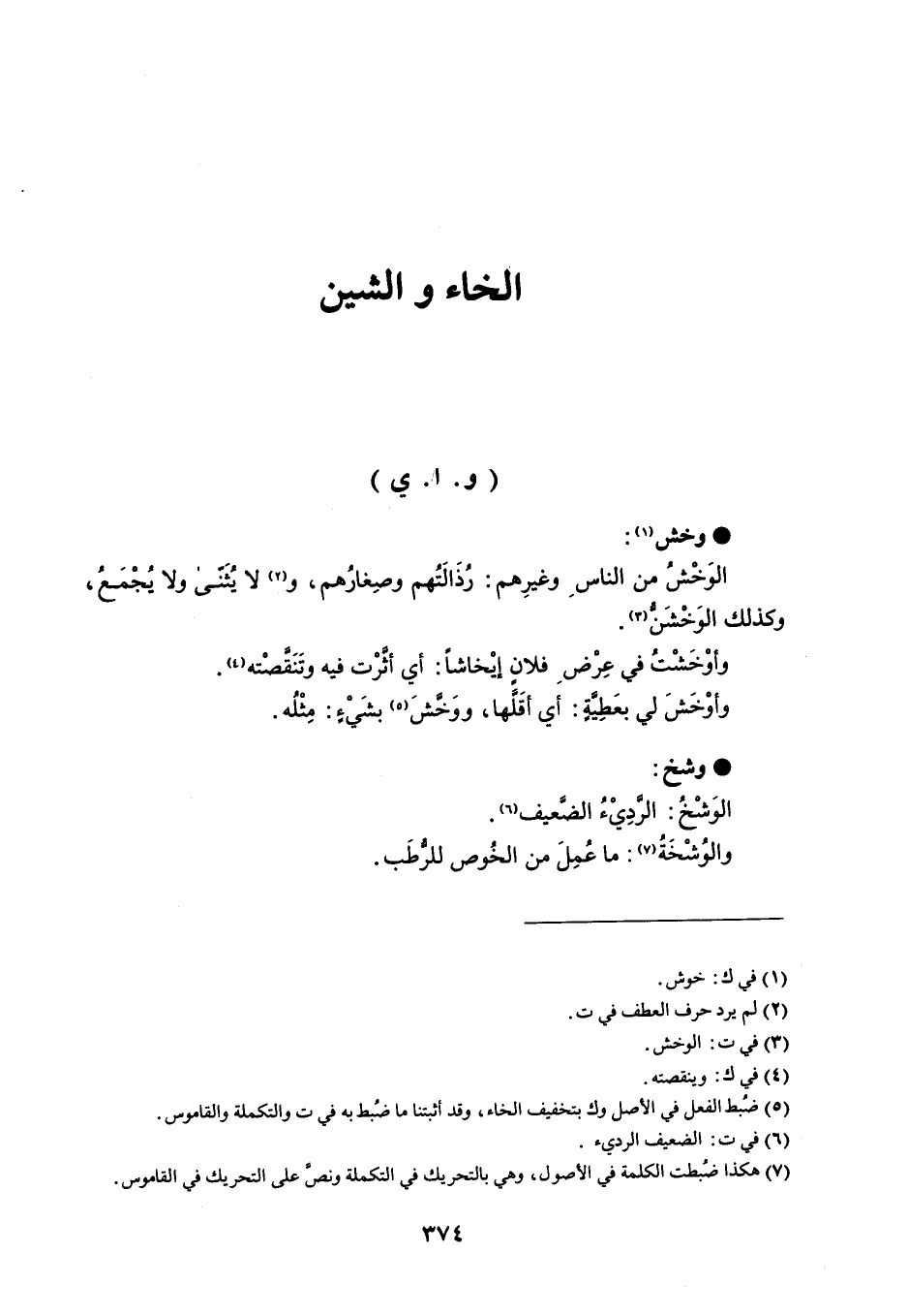 وخش الوَخْشُ من الناس وغيرِهم : رُذَالَتُهم وصِغارُهم ، ولا يُثَنّى ولا يُجْمَعُ ، وكذلك الوَخْشَنُّ . وأوْخَشْتُ في عِرْضِ فلانٍ إيْخاشاً : أي أثَّرْت فيه وتَنَقَّصْته . وأوْخَشَ لي بعَطِيَّةٍ : أي أقَلَّها ، ووَخَّشَ بشَيْءٍ : مِثْلُه . وشخ الوَشْخُ : الرَّدِيْءُ الضَّعيف . والوُشْخَةُ : ما عُمِلَ من الخُوص للرُّطَب .