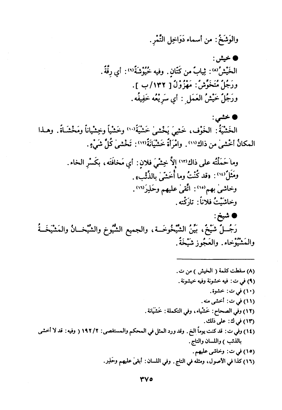 والوَشَخُ : من أسماء دَوَاخِل التَّمْرِ . خيش الخَيْشُ : ثِيابٌ من كَتّانٍ . وفيه خُيُوْشَةٌ : أي رِقَّةٌ . ورَجُلٌ مُتَخَوِّشٌ : مَهْزُوْلٌ . ورَجُلٌ خَيْشُ العَمَلِ : أي سَرِيْعُه خَفِيفُه . خشي الخَشْيَةُ : الخَوْف ، خَشِيَ يَخْشى خَشْيَةً وخَشْياً وخِشْياناً ومَخْشَاةً . وهذا المكانُ أخْشى من ذاك . وامْرَأةٌ خَشْيَانَةٌ : تَخشى كُلَّ شَيْءٍ . وما حَمَلْتُه على ذاك إِلا خِشْيَ فلانٍ : أي مَخافَتَه ، بكَسْرِ الخاء . ومَثَلٌ : قد كُنْتُ وما أخَشّى بالذِّئْب . وخاشى بهم : اتَّقى عليهم وحَذِرَ . وخاشَيْتُ فلاناً : تارَكْته . شيخ رَجُلٌ شَيْخٌ ، بَيِّنُ الشَّيْخُوخَة ، والجميع الشُّيُوخ والشِّيْخانُ والمَشْيَخَةُ والمَشْيُوْخاء . والعَجُوز شَيْخَةٌ .