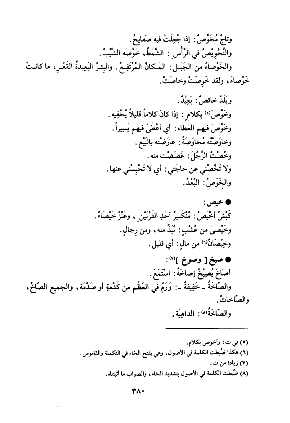 وتاجٌ مُخَوَّصٌ : إذا جُعِلَتْ فيه صَفايحُ . والتَّخْوِيْصُ في الرَّأْسِ : الشَّمَطُ خَوَّصَه الشَّيْبُ . والخَوْصاءُ من الجَبَل : المَكانُ المُرْتَفِعُ . والبِئرُ البَعِيدةُ القَعْرِ ، ما كانتْ خَوْصاءَ ، ولقد خَوِصَتْ وخاصَتْ . وبَلَدٌ خائصٌ : بَعِيْدٌ . وخَوَّصَ بكلامٍ : إذا كانَ كلاماً قليلاً يُخْفِيه . وخَوَّصَ فيهم العَطاء : أي أعْطَى فيهم يَسِيراً . وخاوَصْتُه مُخاوَصَةً : عارَضْته بالبَيْع . وخُصْتُ الرجُلَ : غَضَضْت منه . ولا تَخُصْني عن حاجَتي : أي لا تَحْبِسْني عنها . والخَوَصُ : البُعْدُ . خيص كَبْشٌ أخْيَصُ : مُنْكَسِرُ أحَدِ القَرْنَيْن ، وعَنْزٌ خَيْصَاءُ . وخَيْصى من عُشْبٍ : نُبَذٌ منه ، ومن رِجالٍ . وخِيْصَان من مالٍ : أي قليل . صيخ وصوخ أصَاخ يُصِيْخُ إصاخَةً : اسْتَمَعَ . والصّاخَةُ - خَفِيفة - : وَرَمٌ في العَظْم من كَدْمَةٍ أو صَدْمَة ، والجميع الصّاخُ ، والصّاخاتُ . والصّاخَةُ : الداهِيَة .