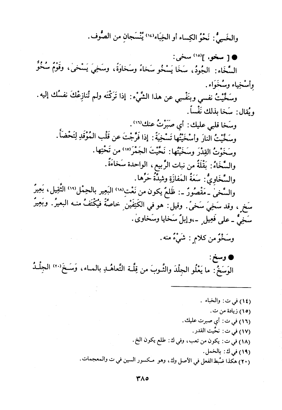 والخَسِيُّ : نَحْوُ الكِساء أو الخِبَاء يُنْسَجانِ من الصُّوف . سخو سخى السَّخَاء : الجُودُ ، سَخَا يَسْخُو سَخاءً وسَخاوَةً ، وسَخِيَ يَسْخى ، وقَوْمٌ سُخُوٌّ وِأسْخِياء وسُخَوَاء . وسَخَّيْتُ نفسي وبنَفْسِي عن هذا الشَّيْء : إذا تَرَكْتَه ولم تُنازِعْكَ نفسُك إليه . ويُقال : سَخا بذلك نَفْساً . وسَخا قلبي عليك : أي صَبَرْتُ عنك . وسَخَّيْتُ النارَ وأسْخَيْتُها تَسْخِيَةً : إذا فَرَّجْتَ عن قَلْب المُوْقَدِ لِتَحْضَأَ . وسَخَوْتُ القِدْرَ وسَخَيْتُها : نَخَّيْتَ الجَمْرَ من تَحْتِها . والسَّخَاءُ : بَقْلَةٌ من نبات الرَّبيع ، الواحدة سَخاءَةٌ . والسَّخَاوِيُّ : سَعَةُ المَفازَةِ وشِدَّةُ حَرِّها . والسَّخى - مَقْصُورٌ - : ظَلغٌ يكون من نَعْتِ البَعِير بالحِمْل الثَّقِيل ، بَعِيرٌ سَخٍ ، وقد سَخِيَ سَخىً . وقيل : هو في الكَتِفَيْن خاصَّةً فيُكْتَفُ منه البعيرُ . وبَعِيرٌ سَخِيٌ - على فَعِيلٍ - ، وإبلٌ سَخايا وسَخاوى . وسَخْوٌ من كلامٍ : شَيْءٌ منه . وسخ الوَسَخُ : ما يَعْلُو الجِلْدَ والثَّوبَ من قِلَّة التَعاهُدِ بالماء ، وَسَخَ الجِلْدُ