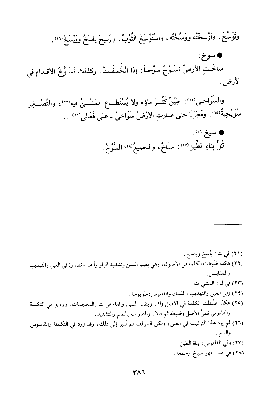 وتَوَسَّخَ ، وأوْسَخْتُه ووَسَّخْتُه ، واسْتَوْسَخَ الثَّوْبُ ، ووَسِخَ ياسَخُ ويَيْسَخُ . سوخ ساخَتِ الأرضُ تَسُوْخُ سَوْخاً : إذا انْخسَفَتْ . وكذلك تَسَوُّخُ الأقدام في الأرض . والسَّوَاخي : طِيْنٌ كَثُرَ ماؤه ولا يُسْتَطاع المَشْيُ فيه ، والتَّصْغِير سُوَيْخِيَةٌ . ومُطِرْنَا حتى صارَتِ الأرْضُ سَوَاخى - على فَعَالى - . سيخ كُلُّ بِناءِ الطِّين : سِيَاخٌ ، والجميعُ السُّوْخُ .
