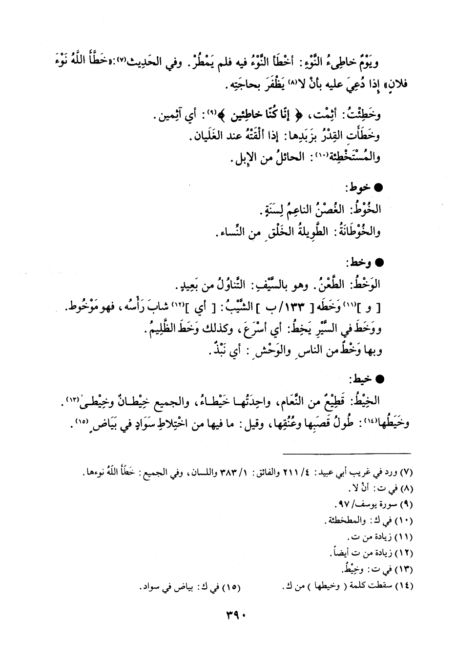 ويَوْمٌ خاطِىءُ النَّوْءِ : أخْطَأ النَّوْءُ فيه فلم يَمْطُرْ . وفي الحَدِيث : ' خَطَّأَ اللهُ نَوْءَ فلانٍ ' إِذا دُعِيَ عليه بأنْ لا يَظْفَرَ بحاجَتِه . وخَطِئْتُ : أثِمْت ، ' إنّا كُنّا خاطِئين ' : أي آثِمين . وخَطَأَتِ القِدْرُ بزَبَدِها : إذا ألْقَتْهُ عند الغَلَيان . والمُسْتَخْطِئة : الحائلُ من الإِبل . خوط الخُوْطُ : الغُصْنُ الناعِمُ لِسَنَةٍ . والخُوْطَانَةُ : الطَّوِيلةُ الخَلْق من النِّساء . وخط الوَخْطُ : الطَّعْنُ . وهو بالسَّيْفِ : التَّناوُلُ من بَعِيدٍ . و ، وَخَطَه ب ، الشَّيْبُ : شابَ رَأْسُه ، فهومَوْخُوط . ووَخَطَ في السَيْرِ يَخِطُ : أي أسْرَعَ ، وكذلك وَخَطَ الظًلِيمُ . وبها وَخْطٌ من الناسِ والوَحْشِ : أي نَبْذٌ . خيط الخِيْط : قَطِيْعٌ من النَّعَام ، واحِدَتُها خَيْطاءُ ، والجميع خِيْطانٌ وخِيْطى . وخَيَطُها : طُولُ قَصَبِها وعُنُقِها ، وقيل : ما فيها من اخْتِلاطِ سَوَادٍ في بَيَاض .