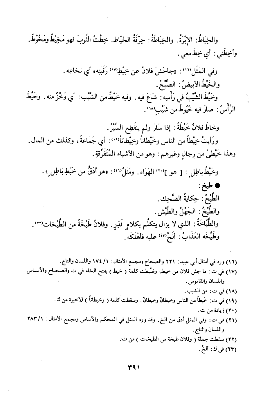 والخِيَاطُ : الإِبْرَةُ . والخِيَاطَةُ : حِرْفَةُ الخَيّاط . خِطْتُ الثَّوبَ فهو مَخِيْطٌ ومَخُوْطٌ . وأخِطْني : أي خِطْ معي . وفي المَثَل : ' جاحَشَ فلانٌ عن خِيْطِ رَقَبَتِه ' أى نخاعِه . والخَيْطُ الأبيضُ : الصُّبْحُ . وخَيَّطَ الشَّيْبً في رَأْسِه : شَاعَ فيه . وفيه خَيْطٌ من الشَّيْب : أي وَخْزٌ منه . وخَيَّطَ الرَّأْسُ : صارَ فيه خُيُوطٌ من شَيْبٍ . وخاطَ فلانٌ خَيْطَةً : إذا سَارَ ولم ينقَطِع السَّيْرُ . ورَأيتُ خِيْطاً من الناس وخَيْطاناً وخِيْطاناً : أي جَمَاعةً ، وكذلك من المال . وهذا خَيْطى من رِجالٍ وغيرهم : وهو من الأشياء المُتَفَرِّقةِ . وخَيْطُ باطِلٍ : هو الهَوَاء . ومَثَلٌ : ' هو أدَقُّ من خَيْطِ باطِلٍ ' . طيخ الطِّيْخُ : حِكايةُ الضَّحِك . والطَّيْخُ : الجَهْلُ والطيْش . والطَّيّاخَةُ : الذي لا يزال يتكلَّم بكلامٍ قَذِرٍ . وفلانٌ طَيْخَةٌ من الطَّيْخات . وطَيَّخَه العَذَابُ : ألَحَّ عليه فأهْلَكَه .