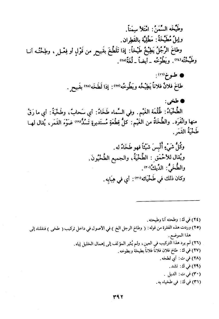 وطَيَّخَه السِّمَنُ : امْتَلأ سِمَناً . وإبلٌ مُطَيَّخَةٌ : مَطْلِيَّة بالقَطِران . وطاخَ الرَّجُلُ يَطِيْخُ طَيْخاً : إذا تَلطَّخَ بقَبيحٍ من قَوْلٍ أو فِعْلٍ ، وطِخْتُه أنا وطَيَّخْتُه . ويَطُوْخُه - أيضاً - لُغَةٌ . طوخ طاخَ فلانٌ فلاناً يَطِيْخُه ويَطُوخُه : إذا لَطَخَه بقَبيحٍ . طخى الطَّخْيَاءُ : ظُلْمَة الغَيْم . وفي السَّماء طَخَاءٌ : أي سَحابٌ ، وطَخْيَةٌ : أي ما رَقً منها وانْفَرَد . والطَّخَاةُ من الغَيْم : كلُّ قِطْعَةٍ مُستَديرةٍ تَسُدُّ ضَوْءَ القَمَر ، يُقال لها طَخْيَةُ القَمَر . وكُلُّ شَيْءٍ أُلْبِسَ شَيْئاًفهوطَخَاءٌ له . ويُقال للأحْمَقِِ : الطَّخْيَةُ ، والجميع الطَّخْيُونَ . والطُّخَيُّ : الدِّ يكُ . وكان ذلك في طَخْيَائه : أي في هِبَابِه . الخاء
