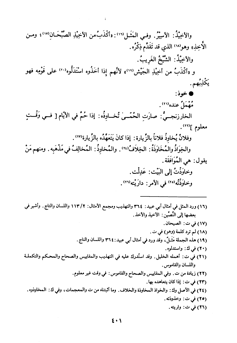 والأخِيْذُ : الأسِيْرُ . وفي المَثَل : ' أكْذَبُ من الأخِيْذِ الصَّبْحَان ومن الأخِذِ ' وهو الذي قد تَقَدَّم ذِكْرُه . والأخِيْذُ : الشَّيْخُ الغَرِيبُ . و ' أكْذَبُ من أخِيْذِ الجَيْش ' لأنَّهم إِذا أخَذُوه اسْتَدَلُّوه على قَوْمِه فهو يَكْذِبُهم . خوذ مُهْمَلٌ عنده . الخارزنجيُّ : صارَتِ الحُمّى تُخاوِذُه : إذا حُمَّ في الأيّام في وَقْتٍ معلوم . وفلانُ يُخاوِذُ فلاناً بالزِّيارة : إذا كانَ يَتَعَهَّدُه بالزِّيارة . والخِوَاذُ والمُخَاوَذَةُ : الخِلاَفُ . والمُخاوِذُ : المُخالِفُ في مَذْهَبِه . ومنهم مَنْ يقول : هي المُوَافَقَة . وخاوَذْتُ إلى البَيْت : عَدِلْت . وخاوَذْتُه في الأمر : دارَيْته .