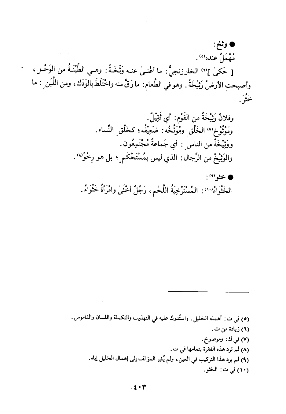 وثخ مًهْمَلٌ عنده . حَكى الخارزنجيُّ : ما أغْنى عنه وَثْخَةً : وهي الطِّيْنَةُ من الوَحْل ، وأصبحتِ الأرضُ وَثيْخَةً . وهو في الطَّعام : ما رَقَّ منه واخْتَلَطَ بالوَدَك ، ومن اللَّبَنِ : ما خَثُرَ . وفلانٌ وَثيْخَةٌ من القَوْم : أي ثَقِيْلٌ . ومَوْثُوْخ الخَلْقِِ ومُوَثَّخُه : ضَعِيْفُه ؛ كخَلْقِِ النِّساء . ووَثيْخَةٌ من الناسِ : أي جَماعةٌ مُجْتَمِعُون . والوَثيْخُ من الرِّجال : الذي ليس بمُسْتَحْكَمٍ ؛ بل هو رِخْوٌ . خثو الخَثْوَاءُ : المُسْتَرْخِيَةُ اللَّحْم ، رَجُلٌ أخْثَى وامْرَأةٌ خَثْوَاءُ .