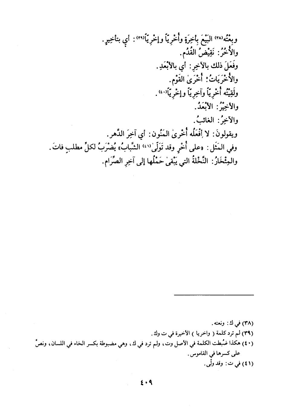 وبِعْتُه البَيْعَ بِأخِرَةٍ واُخْرِيّاً وإخْرِيّاً : أي بتأخِيرٍ . والأُخُرُ : نَقِيْضُ القُدُم . وفَعَلَ ذلك بالآخِرِ : أي بالأبْعَدِ . والأُخْرَيَاتُ . أُخْرَى القَوْم . ولَقِيْتُه أُخْرِيّاً وآخِرِيّاً وإِخْرِيّاً . والأخِيْرُ : الأبْعَدُ . والآخِرُ : الغائبُ . ويقولونَ : لا أفْعَلُه أُخْرى المَنُون : أى آخِرَ الدَهر . وفي المَثَل : ' على أُخْرٍ وقد تَوَلّى الشَّبابُ ' يُضْرَبُ لكلِّ مطلبٍ فاتَ . والمِئْخَارُ : النَّخْلةُ التي يَبْقى حَمْلُها إلى آخِرِ الصِّرَام .