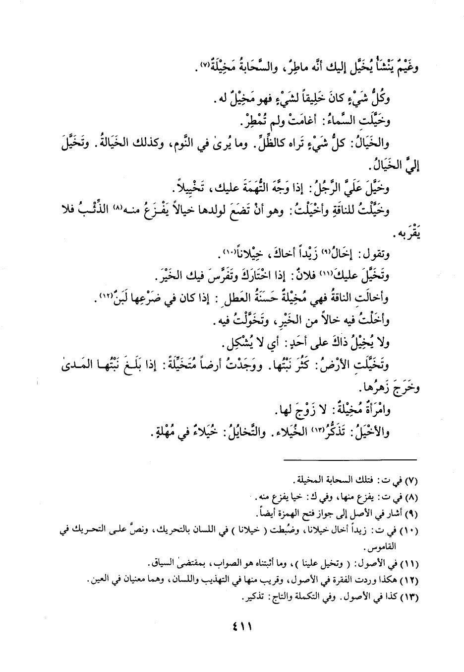 وغَيْمٌ يَنْشَأُ يُخَيَّل إليك أنَّه ماطِرٌ ، والسَّحَابةُ مَخِيْلَةٌ . وكُلُّ شَيْءٍ كانَ خَلِيقاًلشَيْءٍ فهومَخِيْلٌ له . وخَيَّلَتِ السَّماءُ : أغامَتْ ولم تُمْطِرْ . والخَيَالُ : كلُّ شَيْءٍ تَراه كالظِّلِّ . وما يُرى في النَّوم ، وكذلك الخَيَالةُ . وتَخَيَّلَ إليَّ الخَيَالُ . وخَيَّلَ عَلَيَّ الرَّجُلُ : إذا وَجَّهَ التُهَمَةَ عليك ، تَخْيِيلاً . وخَيَّلْتُ للناقَةِ وأخْيَلْتُ : وهو أنْ تَضَعَ لولدها خيالاً يَفْزَعُ منه الذِّئْبُ فلا يَقْرَبه . وتقول : إخَالُ زَيْد اً أخاكَ ، خِيْلاناً . وتَخَيَّلَ عليكَ فلانٌ : إذا اخْتَارَكَ وتَفَرَّسَ فيك الخَيْرَ . وأخالَتِ الناقةُ فهي مُخِيْلةٌ حَسَنَةُ العَطلِ : إذا كان في ضَرْعِها لَبَنٌ . وأخَلْتُ فيه خالاً من الخَيْرِ ، وتَخَوَّلْتُ فيه . ولا يُخِيْلُ ذاكَ على أحَدٍ : أي لا يُشْكِل . وتَخَيَّلَتِ الأرْضُ : كَثُرَ نَبْتُها . ووَجَدْتُ أرضاً مُتَخَيِّلَةً : إذا بَلَغَ نَبْتًها المَدى وخَرَخ زَهرُها . وامْرَأةٌ مُخِيْلةٌ : لا زَوْجَ لها . والأخْيَلُ : تَذَكُّرُالخيَلاء . والتَّخايُلُ : خُيَلاءٌ في مُهْلةٍ