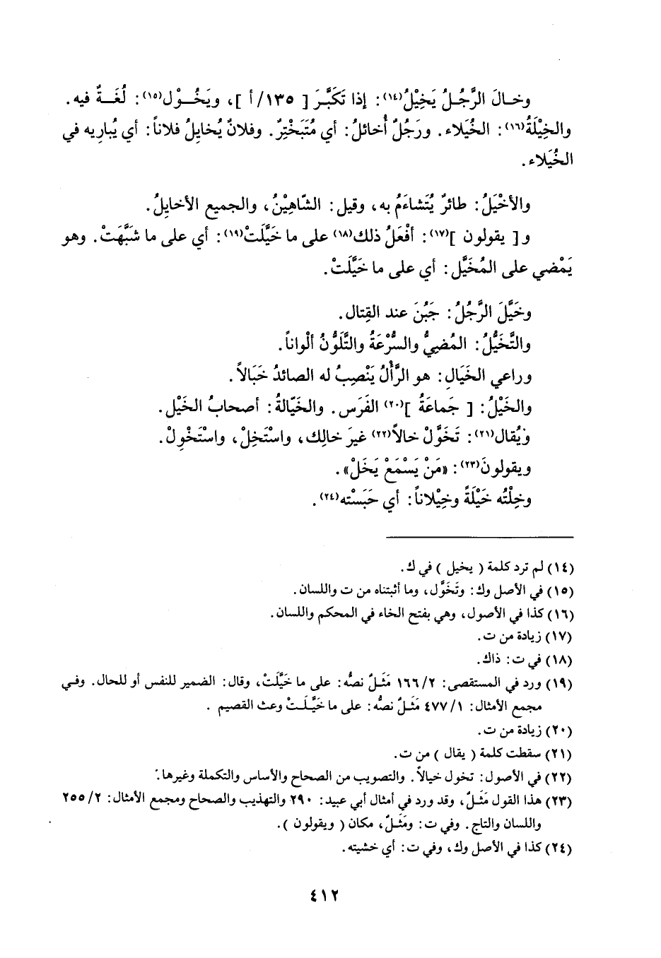 . وخالَ الرَّجُلُ يَخِيْلُ : إذا تَكَبَّرَ ، ويَخُوْل : لُغَةٌ فيه . والخِيْلَةً : الخُيَلاء . ورَجُلٌ أُخائلُ : أي مُتَبَخْتِرٌ . وفلانٌ يُخايِلُ فلاناً : أي يُبارِيه في الخُيَلاء . والأخْيَلُ : طائرٌ يُتَشاءَمُ به ، وقيل : الشّاهِيْنُ ، والجميع الأخايِلُ . ويقولون : أفْعَلُ ذلك على ما خَيَّلَتْ : أي على ما شَبَّهَتْ . وهو يَمْضي على المُخَّيل : أي على ما خَيَّلَتْ . وخَيَّلَ الرجُلُ : جَبُنَ عند القِتال . والتَّخَيُّلُ : المُضِيُّ والسُّرْعَةُ والتَّلَوُّنُ ألْواناً . وراعي الخَيَالِ : هو الرَّأْلُ يَنْصِبُ له الصائدُ خَبَالاً . والخَيْلُ : جَماعَةُ الفَرَس . والخَيّالةُ : أصحابُ الخَيْل . ؤيُقال : تَخَوَّلْ خالاً غيرَ خالِك ، وا سْتَخِلْ ، واسْتَخْوِلْ . ويقولونَ : ' مَنْ يَسْمَعْ يَخَلْ ' . وخِلْتُه خَيْلَةً وخِيْلاناً : أي حَبَسْته .