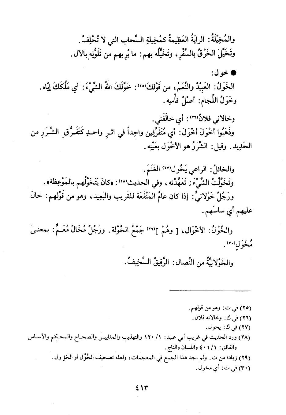 والمُخِيْلَةُ : الرايَةُ العَظِيمةُ كمُخِيلةِ السَّحاب التي لا تُخْلِفُ . وتَخَيَّلَ الخَرْقُ بالسَّفْرِ ، وتَخَيُّلُه بهم : ما يُرِيهم من تَلَوُّنِه بالآل . خول الخَوَلُ : العَبِيْدُ والنِّعَمُ ، من قَوْلكَ : خَوَّلَكَ اللهُ الشَّيْءَ : أي مَلَّكَكَ إيّاه . وخَوَلُ اللِّجام : أصْلُ فأْسِه . وخالاني فلانٌ : أي خالَفَنيِ . وذَهَبُوا أخْوَلَ أخْوَلَ : أي مُتَفَرِّقِين واحِداً في اثرِ واحدٍ كَتَفَرُّقِ الشًرَرِ من الحَدِيد . وقيل : الشَّرَرُهو الأخْوَل بعَيْنِه . والخائلُ : الراعي يَخُول الغَنَمَ . وتَخَوَّلْتُ الشَّيْءَ : تَعَهَّدْته ، في الحديث : ' كانَ يَتَخَوَّلُهم بالمَوْعِظة ' . ورَجُلٌ خَوْلانيٌّ : إذا كان عامَّ المَنْفَعَة للقَريب والبَعِيد ، وهو من قَوْلهم : خالَ عليهم أي ساسَهم . والخُوْلُ : الأخْوَال وهُمْ جَمْعُ الخُوْلة . ورَجُلٌ مُخَالٌ مُعَمٌ : بمعنى مُخْوَلٍ . والخَوْلانِيَّةً من النِّصال : الرَّقِيقُ السَّخِيفُ .
