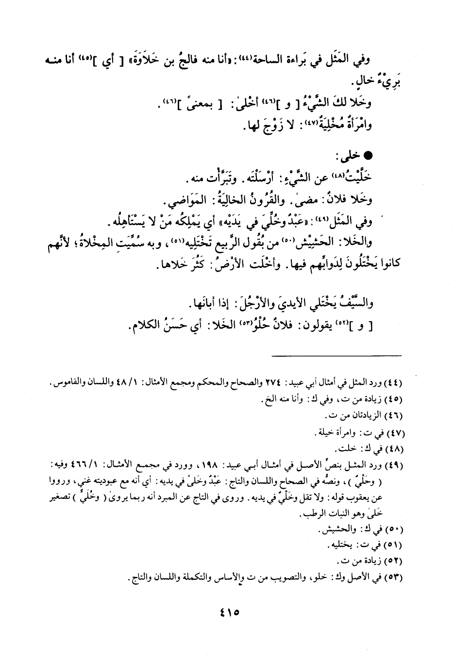 وفي المَثَل في بَراءة الساحة : ' أنا منه فالجُ بن خَلاَوَةَ ' أي أنا منه بَرِيْءٌ خالٍ . وخَلا لكَ الشَّيْءُ وأخْلى : بمعنىً . وامْرَأة مُخْلِيَةٌ : لا زَوْخ لها . خلى خَلَّيْتُ عن الشَّيْءِ : أرْسَلْتَه . وتَبَرَّأْت منه . وخَلا فلانٌ : مضى . والقُرُونُ الخالِيَةُ : المَوَاضي . وفي المَثَل : ' عَبْدٌ وخُلِّيَ في يَدَيْه ' أي يَمْلِكُه مَنْ لا يَسْتَأْهِلُه . والخَلا : الحَشِيْش من بُقُول الرَّبيع تَخْتَلِيه ، وبه سُمِّيَتِ المِخْلاةُ ؛ لأنَّهم كانوا يَخْتَلُونَ لِدَوابِّهم فيها . وأخْلَت الأرْضُ : كَثُرَ خَلاها . والسَّيْفُ يَخْتَلي الأيديَ والأرْجُلَ : إذا أبانَها . رضي الله عنها يقولون : فلانٌ حُلْوُ الخَلا : أي حَسَنُ الكلام .