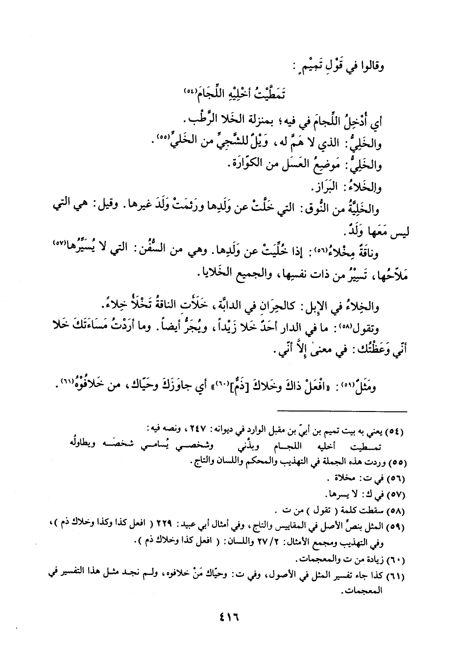 وقالوا في قَوْلِ تَمِيْمً : تَمَطَّيْتُ أخْلِيْهِ اللِّجَامَ أي أُدْخِلُ اللِّجامَ في فيه ، بمنزلة الخَلا الرَّطْب . والخَلِيُّ : الذي لا هَمَّ له ، وَيْلٌ للشَّجِيِّ من الخَليِّ . والخَلِيُّ : مَوضِعُ العَسَل من الكوّارَة . والخَلاءُ : البَرَاز . والخَلِيَّةُ من النُّوق : التي خَلَّتْ عن وَلَدِها ورَئمَتْ وَلَدَ غيرها . وقيل : هي التي ليس مَعَهاوَلَدٌ . وناقَةٌ مِخْلاءُ : إذا خُلِّيَتْ عن وَلَدِها . وهي من السُّفُن : التي لا يُسَيِّرُها مَلاّحُها ، تَسِيْرُ من ذات نفسِها ، والجميع الخَلايا . والخِلاءُ في الإِبل : كالحِرَانِ في الدابَّة ، خَلأََتِ الناقةُ تَخْلأُ خِلاءً . وتقول : ما في الدار أحَدٌ خَلا زَيْداً ، ويُجَرُّ أيضاً . وما أرَدْتُ مَسَاءَتَكَ خَلا أنّي وَعَظْتُك : في معنى إِلأَّ أنّي . ومَثَلٌ : ' افْعَلْ ذاكَ وخَلاكَ ذَمٌّ ' أي جاوَزَكَ وحَيّاك ، من خَلافُوْهُ .