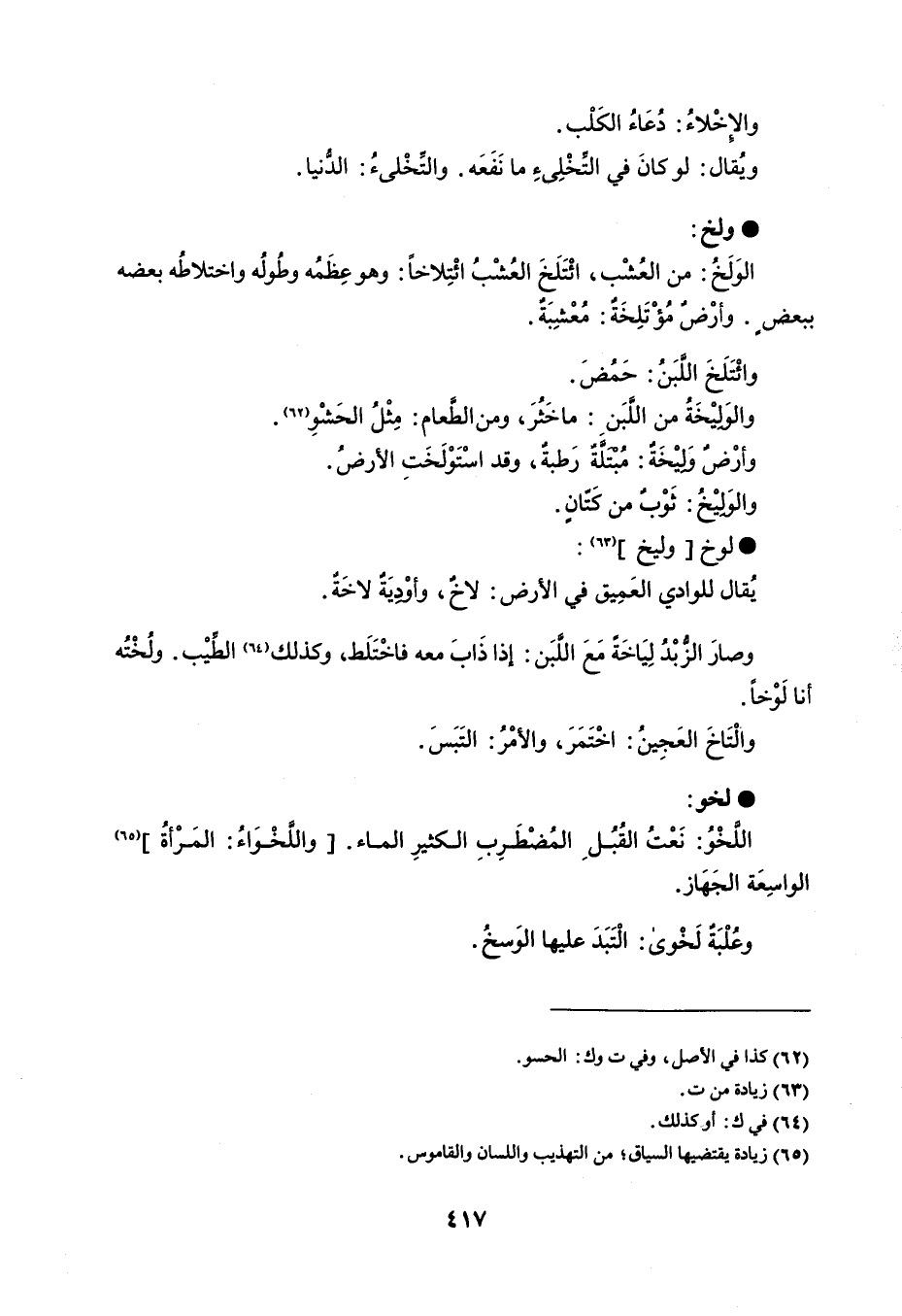والإِخْلاءُ : دُعَاءُ الكَلْب . ويُقال : لوكانَ في التِّخْلِىءُ ما نَفَعَه . والتِّخْلىءُ : الدُّنيا . ولخ الوَلَخُ : من العُشْب ، ائْتَلَخَ العُشْبُ ائْتِلاخاً : وهو عِظَمُه وطُولُه واختلاطُه بعضه ببعضٍ . وأرْضٌ مؤْتَلِخَةُ : مُعْشِبَة . وائْتَلَخَ اللَّبَنُ : حَمُضَ . والوَليْخَةُ من اللَّبَنِ : ماخَثُرَ ، ومن الطَّعام : مِثْلُ الحَشْوِ . وأرْضٌ وَليْخَةٌ : مُبْتَلَّةٌ رَطبةٌ ، وقد اسْتَوْلَخَتِ الأرضُ . والوَلِيْخُ : ثَوْبٌ من كَتّانٍ . لوخ وليخ يقال للوادي العَمِيق في الأرض : لاخٌ ، وأوْدِيَةٌ لاخَةٌ . وصارَ الزُّبْدُ لِيَاخَةً مَعَ اللَّبَن : إذا ذَابَ معه فاخْتَلَط وكذلك الطِّيْب . ولُخْتُه أنا لَوْخاً . والْتَاخَ العَجِينُ : اخْتَمَرَ ، والأمْرُ : التَبَسَ . لخو اللَّخْوُ : نَعْتُ القُبُلِ المُضْطَرِبِ الكثيرِ الماء واللَّخْوَاءُ : المَرْأةُ الواسِعَة الجَهَاز . وعُلْبَةٌ لَخْوى : الْتَبَدَ عليها الوَسخُ .