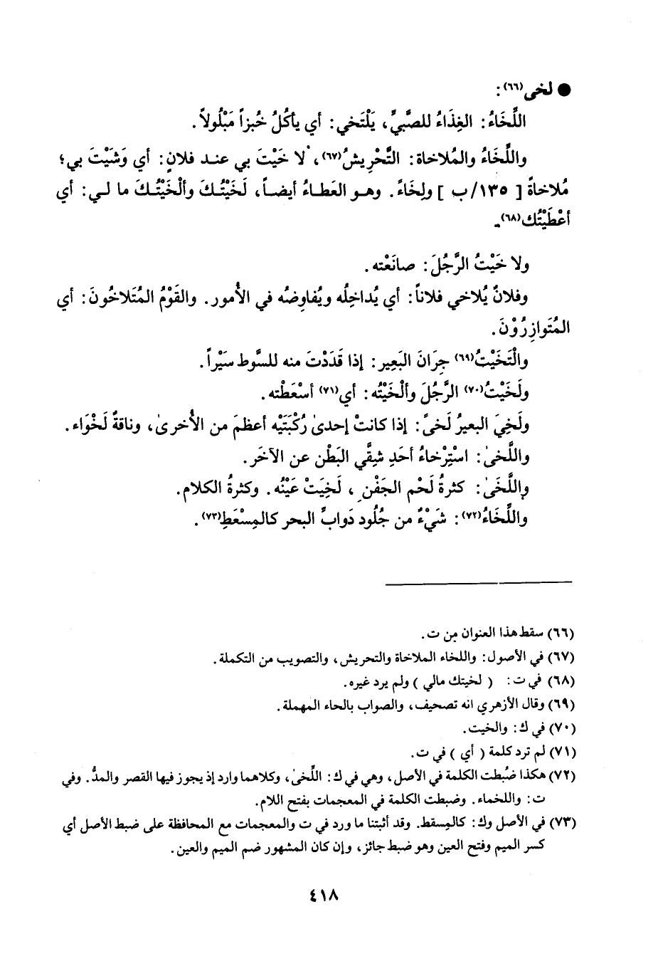 لخى اللِّخَاءُ : الغِذَاءُ للصَّبيِّ ، يَلْتَخي : أي يأكُلُ خُبزاً مَبْلُولاً . واللِّخَاءُ والمُلاخاة : التَّحْرِيشُ ، لا خَيْتَ بي عند فلانٍ : أي وَشَيْتَ بي ؛ مُلاخاةً ولِخَاءً . وهو العَطاءُ أيضاً ، لَخَيْتُكَ وألْخَيْتُكَ ما لي : أي أعْطَيْتك . ولا خَيْتُ الرَّجُلَ : صانَعْته . وفلانٌ يُلاخي فلاناً : أي يُداخِلُه ويُفاوِضُه في الأُمور . والقَوْمُ المُتَلاخُونَ : أي المُتَوازِرُوْنَ . والْتَخَيْتُ جِرَانَ البَعِير : إذا قَدَدْتَ منه للسَّوط سَيْراً . ولَخَيْتُ الرَّجُلَ وألْخَيْتُه : أي أسْعَطْته . ولَخِيَ البعيرُ لَخىً : إذا كانتْ إحدى رُكْبَتَيْه أعظمَ من الأُخرى ، وناقةٌ لَخْوَاء . واللَّخى : اسْتِرْخاءُ أحَدِ شِقِّي البَطْن عن الآخَر . واللَّخَى : كثرةُ لَحْم الجَفْن ، لَخِيَتْ عَيْنُه . وكثرةُ الكلام . واللِّخَاءُ : شَيْءٌ من جُلُود دوابِّ البحركالمِسْعَطِ .