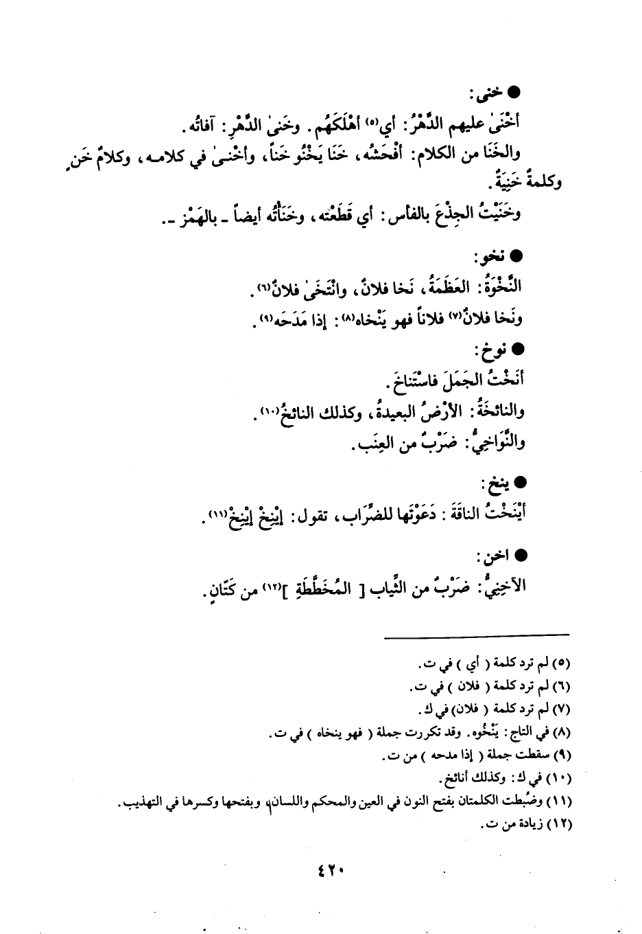 خنى أخْنَى عليهم الدَّهرُ : أي أهْلَكَهُم . وخَنى الدَّهْرِ : آفاتُه . والخَنَا من الكلام : أفْحَشُه ، خَنَا يَخْنُو خَناً ، وأخْنى في كلامه ، وكلامٌ خَنٍ وكلمةٌ خَنِيَةٌ . وخَنَيْتُ الجِذْعَ بالفأس : أي قَطَعْته ، وخَنأْتُه أيضاً - بالهَمْز - . نخو النَّخْوَةُ : العَظَمَةُ ، نَخا فلانٌ ، وانْتَخَى فلان ، ونَخا فلانٌ فلاناً فهو يَنْخاه : إذا مَدَحَه . نوخ أنَخْتُ الجَمَلَ فاسْتَناخَ . والنائخَةُ : الأرْضُ البعيدةُ ، وكذلك النائخُ . والنَّوَاخِيُّ : ضَرْبٌ من العِنَب . ينخ أيْنَخْتُ الناقَةَ : دَعَوْتَها للضِّرَاب ، تقول : إيْنخْ إيْنِخْ . اخن الآخِنيُّ : ضَرْبٌ من الثياب المُخَطَّطَةِ من كَتّانٍ .