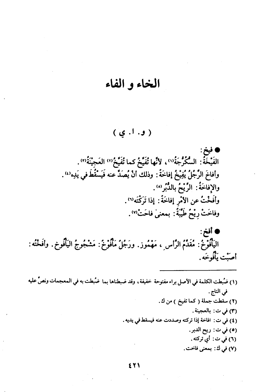 فيخ الفَيْخَةُ : السُّكرُّجَةُ ، لأنَّها تُفَيَّخُ كما تُفَيَّخُ العَجِيْنَةُ . وأفاخَ الرجُلُ يُفِيْخُ إفاخَةً : وذلك أن يُصَدَّ عنه فَيَسْقُطَ في يَدِه . والإفاخَةُ : الريْحُ بالدُّبُر . وأفَخْتُ عن الأمْرِ إفاخَةً : إذا تَرَكْتَه . وفاخَتْ رِيْحٌ طَيِّبَةٌ : بمعنى فاحَتْ . أفخ اليَأفوْخُ : مقَدَّمُ الرَّأس ، مَهْمُوز . ورَجُلٌ مَأفوْخٌ : مَشْجوجُ اليَأفوخ . وأفَخْتُه : أصَبْت يَأفوخَه .