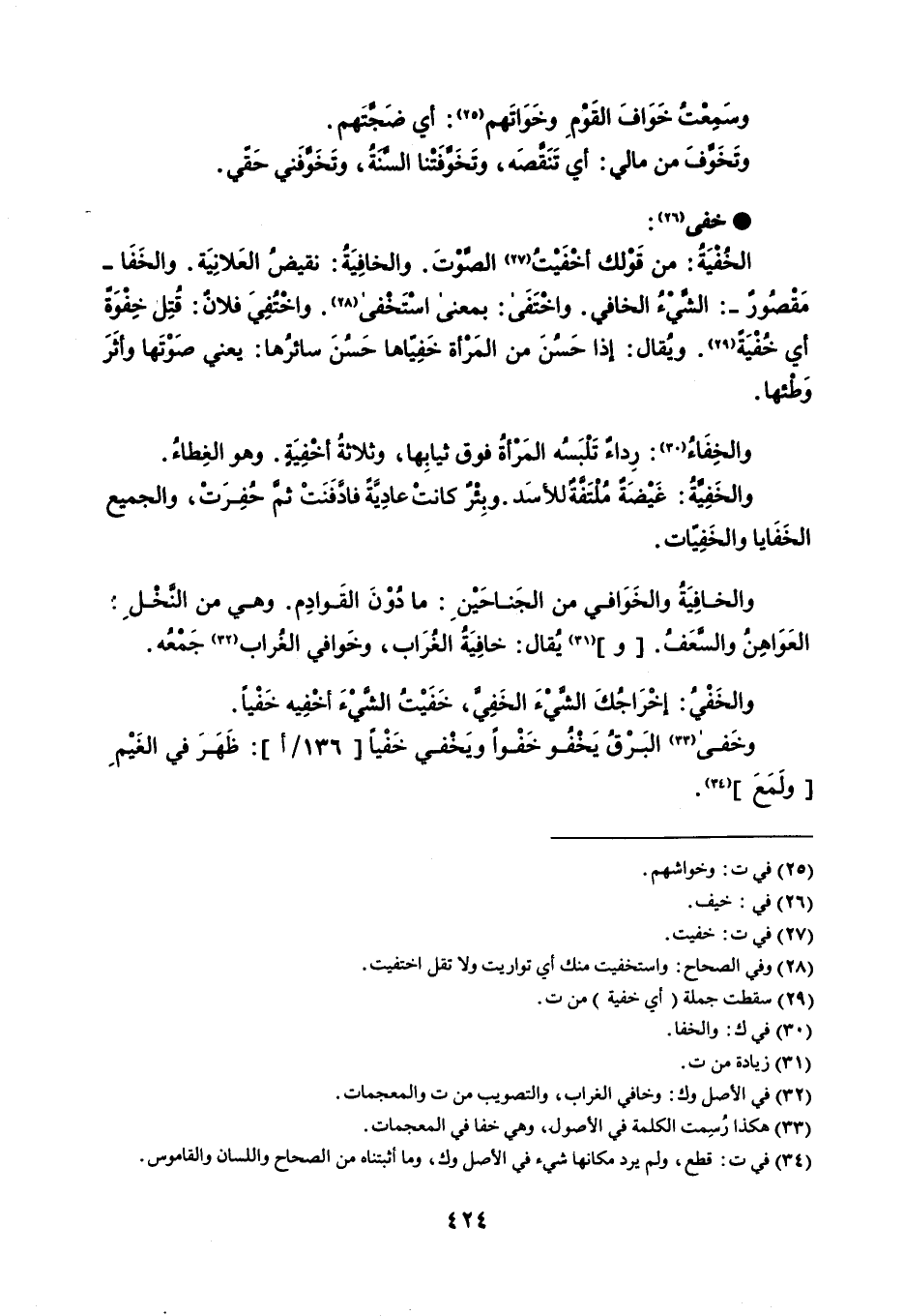 وسمعت خواف القوم وخواتهم : أي ضجتهم وتخوَّف من مالي : أي تنقَّصه ، وتخوَّفتنا السَّنة ، وتخوَّفني حقّي . خفى الخُفيَةُ : من قولك أخْفَيتُ الصوتَ . والخافِيةُ : نقيضُ العَلانِيَة . والخَفَا - مَقْصُور - : الشيءُ الخافي . واخْتَفَى : بمعنى اسْتَخْفى . واخْتُفِيَ فلان : قُتِل خِفْوَةً أي خُفْيَةً . ويُقال : إذا حَسُنَ من المَرأة خَفِيّاها حَسُنَ سائرها : يعني صَوْتَها وأثَرَ وَطئها . والخِفَاءُ : رِداء تَلْبَسُه المَرأةُ فوق ثيابها ، وثلائةُ أخفِيَه . وهو الغِطاءُ . والخَفِيةُ : غَيْضَة مُلتَفَّةٌ للأسَد . وبِئْرٌ كانتْ عادِيَّةً فادَّفَنَتْ ثم حُفِرَت ، والجميع الخَفَايا والخَفِيّات . والخافِيَةُ والخَوَافي من الجَناحَيْن : ما دُوْنَ القَوادِم . وهي من النخْل العَوَاهِنُ والسعَفُ . يُقال : خافِيَةُ الغرَاب ، وخَوافي الغُراب جَمْعُه . والخَفيُ : إخْرَاجُكَ الشيْءَ الخَفي ، خَفَيْتُ الشيْء أخْفِيه خَفْياً . وخَفى البَرْقُ يَخْفُو خَفْواً ويَخْفي خَفْياً : ظَهَرَ في الغَيْم ولَمَعَ .
