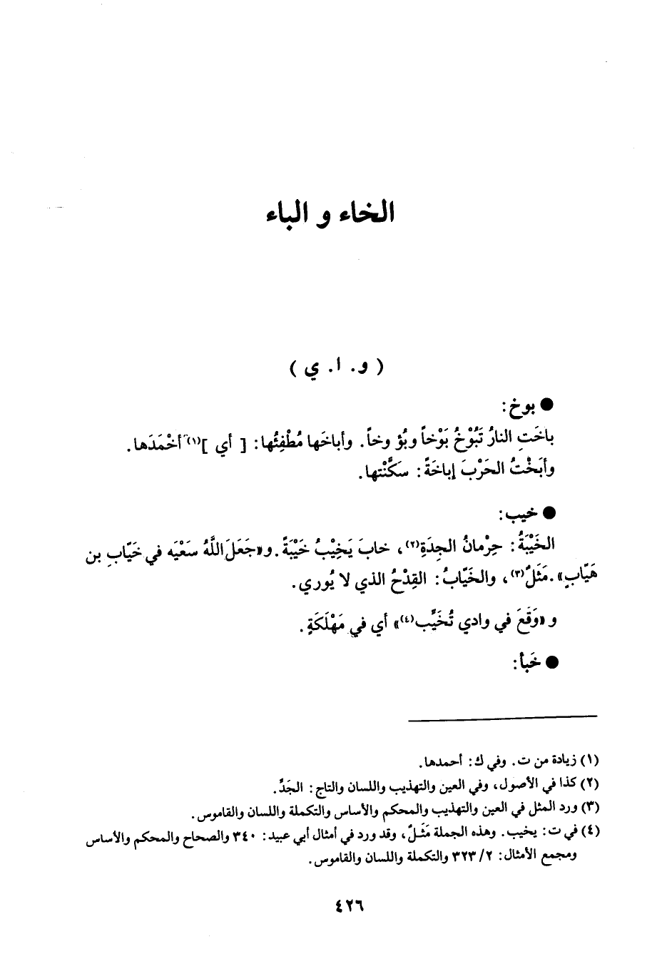 ' بوخ باخَتِ النارُ تَبُوْخُ بَوْخاً وبُؤ وخاً . وأباخَها مُطفِئُها : أي أخْمَدَها . وأبَخْتُ الحَرْبَ إباخَةً : سَكنْتها . خيب الخَيْبَةُ : حِرْمانُ الجِدَةِ ، خابَ يَخِيْبُ خَيْبَةً . و ' جَعَلَ اللهُ سَعْيَه في خَيّابِ بن هَيَابٍ ' . مَثَلٌ ، والخَيّاب : القِدْحُ الذي لا يُوري . و ' وَقعَ في وادي تُخَيب ' أي في مَهْلَكَةٍ . خَبأ