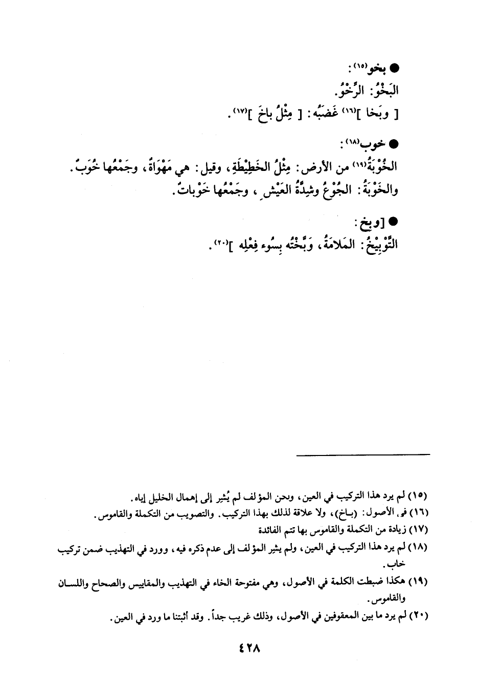بخو البَخْوُ : الرخْوُ . وبَخا : غَضَبُه : مِثْلُ باخَ . خوب الخُوْبَةُ من الأرض : مِثْلُ الخَطِيْطَةِ ، وقيل : هي مَهْوَاةٌ ، وجَمْعُها خُوَب . والخَوْبَةُ : الجُوْعُ وشِدةُ العَيْش ، وجَمْعُها خَوْباتٌ . وبخ التوْبِيْخُ : المَلامَة ، وبخْتُه بِسُوء فِعْلِه .