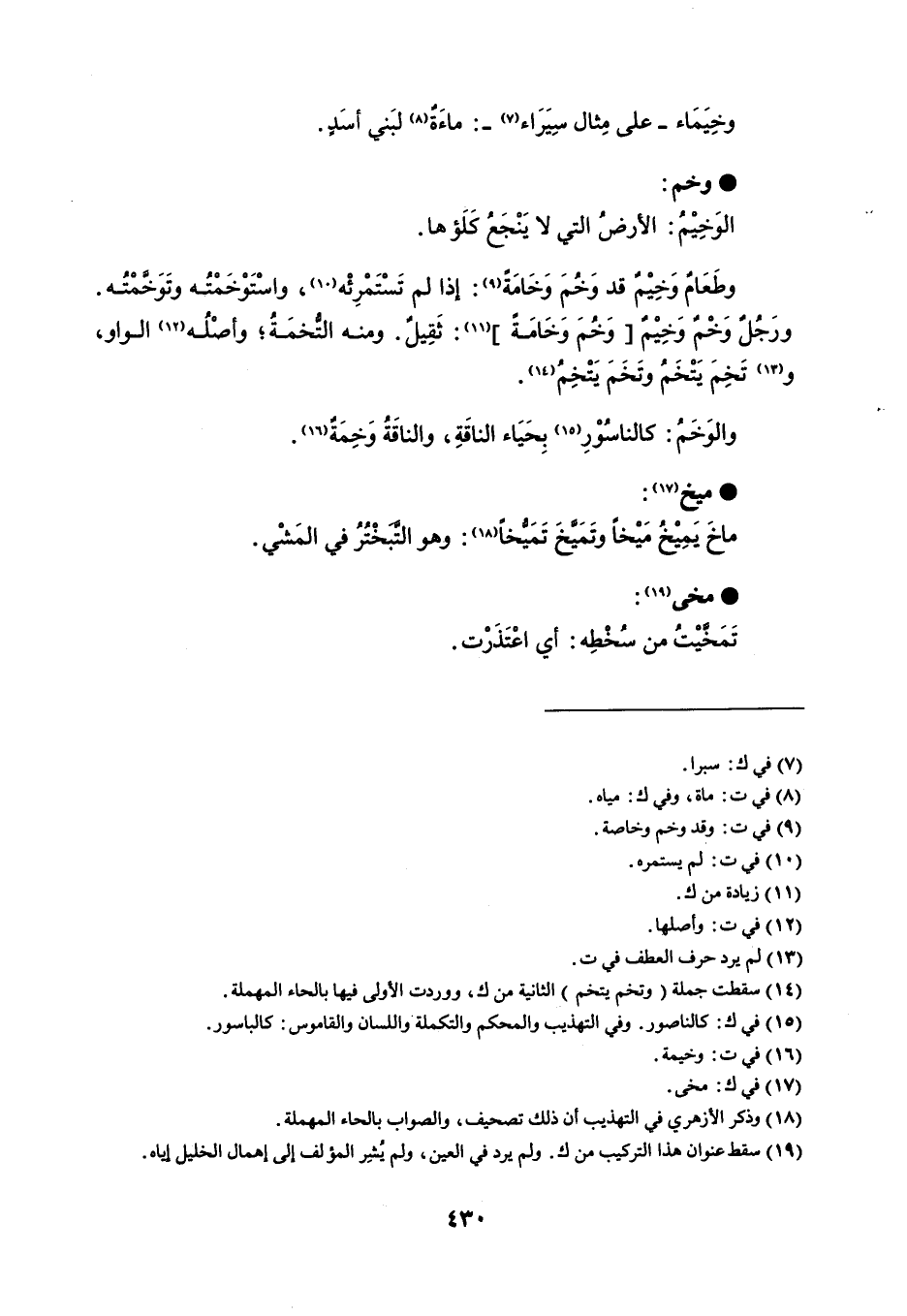 وخِيَمَاء - على مِثال سِيَرَاء - : ماءةٌ لبَني أسَدٍ . وخم الوَخِيْمُ : الأرضُ التي لا يَنْجَعُ كَلَؤها . وطَعَامٌ وَخِيْئم قد وَخُمِ وَخَامَةً : إذا لم تَسْتَمْرِئْه ، واسْتَوْخَمْتُه وتَّوَخمْتُه . ورَجُل وَخْم وَخِيْمٌ وَخُمَ وخَامَةً : ثَقِيل . ومنه التخمَةُ وأصْلُه الواو ، وتَخِمَ يَتْخَمُ وتَخَمَ يَتْخِمُ . والوَخَمُ : كالناسُوْر بِحَيَاء الناقَةِ ، والناقَةُ وَخِمَةٌ . ميخ ماخَ يَمِيْخُ مَيْخاً وتَمَيخَ تَميخاً : وهو التبخْتُرُ في المَشْي . مخى تَمَخيْتُ من سُخْطِه : أي اعْتذَرْت .