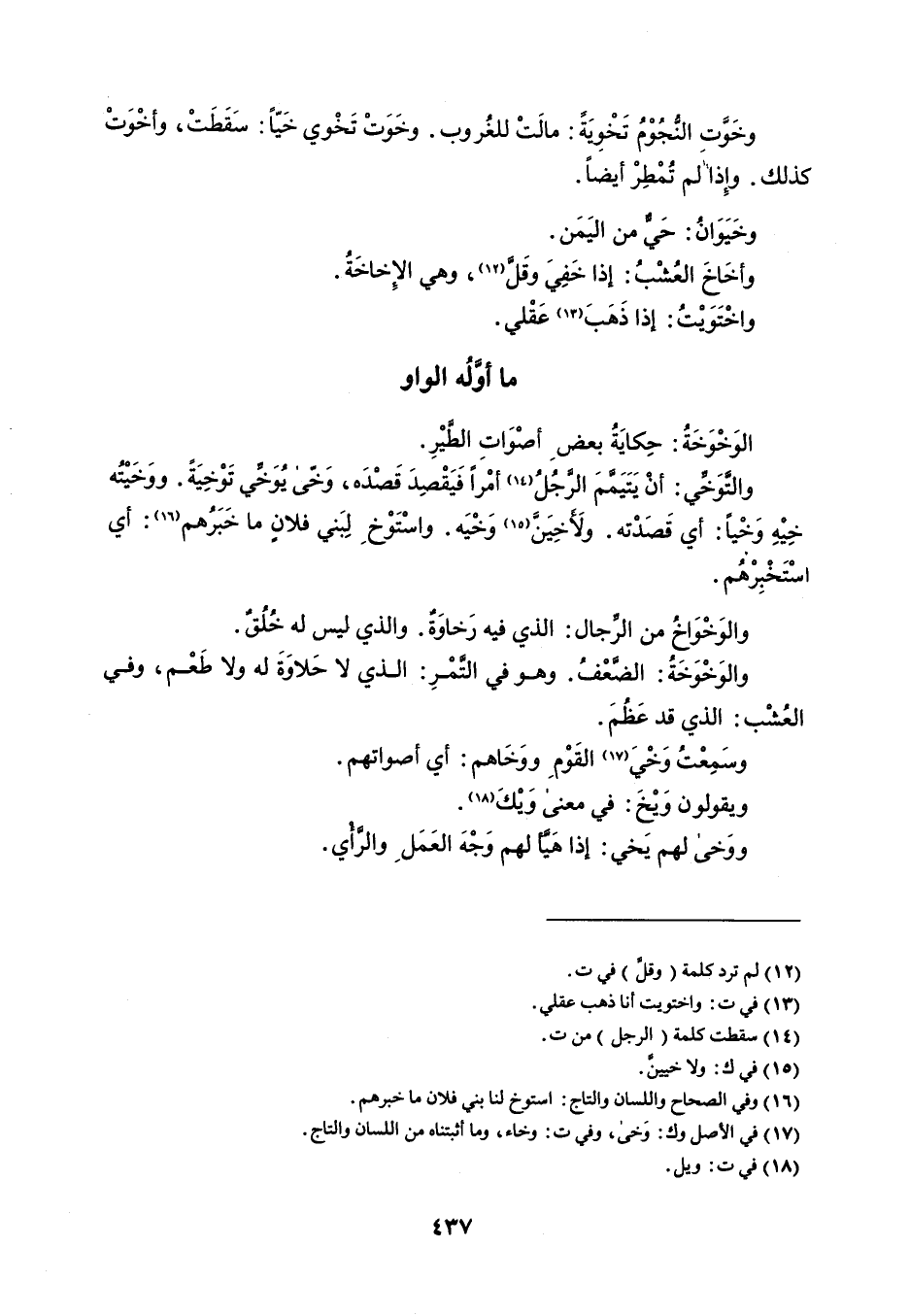 وخَوَت النُجُوْمُ تَخْوِيَةً : مالَتْ للغُروب . وخَوَتْ تَخْوي خَيّاً : سَقَطَتْ ، وأخْوَتْ كذلك . وإِذا لم تُمْطِرْ أيضاً . وخَيَوَانُ : حيط من اليَمَن . وأخَاخ العُشْبُ : إذا خَفِيَ وقَل ، وهي الإِخاخَةُ . واخْتَوَيْتُ : إذا ذهب عَقْلي .