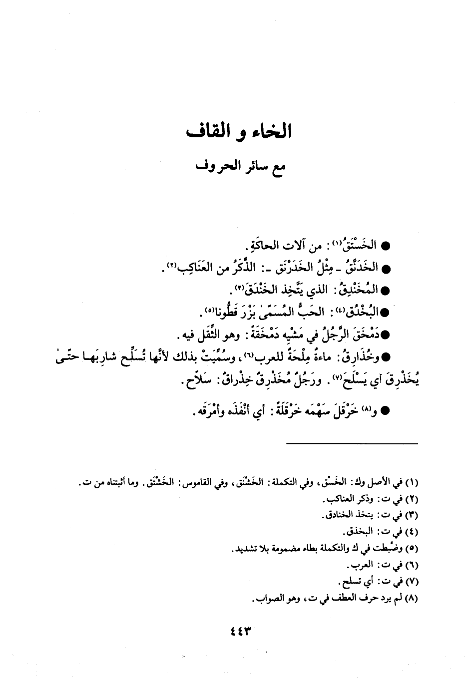 الخَسْتَقُ من آلات الحاكَةِ . الخَدَنقُ - مِثْلُ الخَدَرْنَق - الذكَرُ من العَناكب . المُخَندِقُ الذي يَتخِذ الخَنْدَقَ . البُخْدُق الدَب المُسَمّى بَزْرَ قَطونا . دَمْخَقَ الرجُلُ في مَشْيِه دَمْخَقَةً وهو الثقَل فيه . وخُذَارِقُ ماءةٌ مِلْحَةٌ للعرب ، وسُميَتْ بذلك لأنَها تُسلَح شارِبَها حتّى يحذْرِقَ أي يَسْلَحَ . ورَجُلٌ مُخَذْرِق خِذْراق سَلاح . وخَرْقَلَ سَهْمَه خَرْقَلَةً أي أنْفذَه وأمْرَقَه .