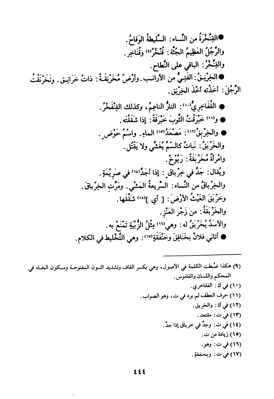 القِنخْرَةُ من النساء السليطةُ الوَقاحُ . والرجُلُ العَظِيمُ الجُثة قُنْخُرٌ وقُنَاخِر . والقِنخْرُ الباقي على النطاح . الخِرنقُ الفَتِي من الأرانب . وأرْضٌ مُخَرْنقَةٌ ذاتُ خَرَانِق . وتخرنقت الرجُلَ أخَذْته أخْذَ الخِرْيق . القُفَاخِرِيّ التار الناعِمُ ، وكذلك القِنْفَخْرُ . وخَبْرَقْتُ الثوبَ خَبْرَقَةً إذا شَقَقْتَه . والخِرْبِق مَصْعَد الماءِ . واسْمُ حَوْض . والخَرْبَقُ نَبات كالسم يُغَشي ولا يَقْتُل . وامْرأةٌ مُخَربَقَةٌ رَبُوْخ . ويُقال جَد فى خِرْباق إذا أجد في صَرِيْمَةٍ . والخِرْباقُ من النساء السريعةُ المَشي . ومَرتِ الخِرْباقَ . وخَرْبَقَ الغَيْثُ الأرْضَ : أي شَققَها . والخَرْبَقَةُ : من زَجْر العَنْزِ . والأسَدُ يُخَرْبَقُ له : وهي مِثْلُ الزبْيَةِ تَمْنَعُ به . أتاني فلانٌ بخَنَافِقَ وخَنْفَقَةٍ وهي التخْليط في الكلام .