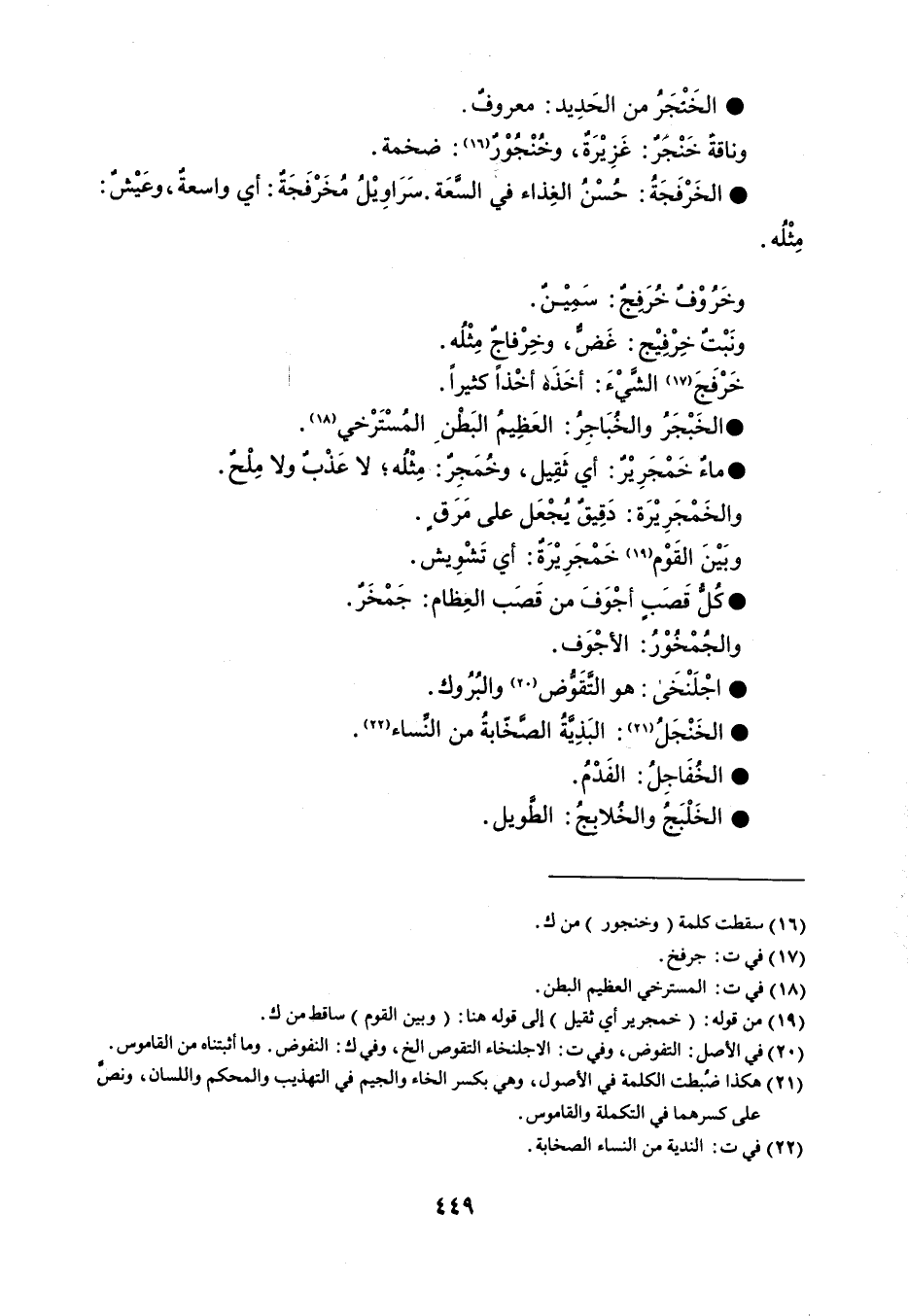 الخَنْجَرُ من الحَدِيد معروفٌ . وناقة خَنْجَر غَزِيْرَةٌ ، وخُنْجُوْرٌ ضخمة . الخَرْفَجَةُ حُسْنُ الغِذاء في السَّعَة . سَرَاوِيْلُ مُخَرْفَجَة أي واسعة ، وعَيْشٌ مثله . وخَرُوْف خُرَفِجٌ سَمِيْن . ونَبْتٌ خِرْفِيْج غَض ، وخِرْفاج مِثْلُه . خَرْفَجَ الشَّيْء أخَذَة أخْذاً كثيراً . الخَبْجَرُ والخُبَاجِرُ العَظِيمُ البَطْن المُسْتَرْخي . ماءٌ خَمْجَرِيْرٌ أي ثَقِيل ، وخُمَجِرٌ مِثْلُه ؛ لا عَذْبٌ ولا مِلْح . والخَمْجَرِيْرَة دَقِيقٌ يُجْعَل على مَرَق . وبَيْنَ القَوْم خَمْجَرِيْرَة أي تَشْوِيش . كُلُّ قَصَبٍ أجْوَفَ من قَصَب العِظام جَمْخَرَ . والجُمْخُوْرُ الأجْوَف . اجْلَنْخَى هو التقَوض والبُرُوك . الخَنْجَلُ البَذِيةُ الصخابةُ من النساء . الخُفَاجِلُ الفَدْمُ . الخَلْبَجُ والخُلابجُ الطَّويل .