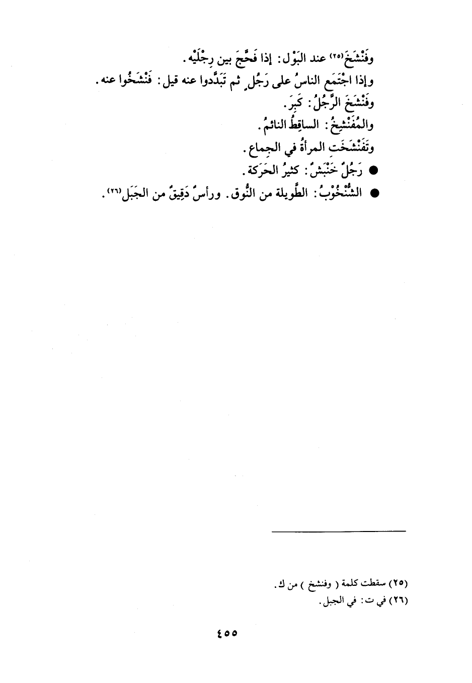 وفَنْشَخ عند البَوْل إذا فَحجَ بين رِجْلَيْه . وإذا اجْتَمَع الناسُ على رَجُل ثم تَبددوا عنه قيل فَنْشَخُوا عنه . وفَنْشَخَ الرَّجُلُ كَبِرَ . والمُفَنْشِخُ الساقِطُ النائمُ . وتَفَنْشَخَتِ المرأةُ في الجِماع . رَجُل خَنْبَشٌ كثيرُ الحَرَكة . الشُنْخُوْبُ الطَويلة من النُّوق . ورأس دَقِيقٌ من الجَبَل . باب