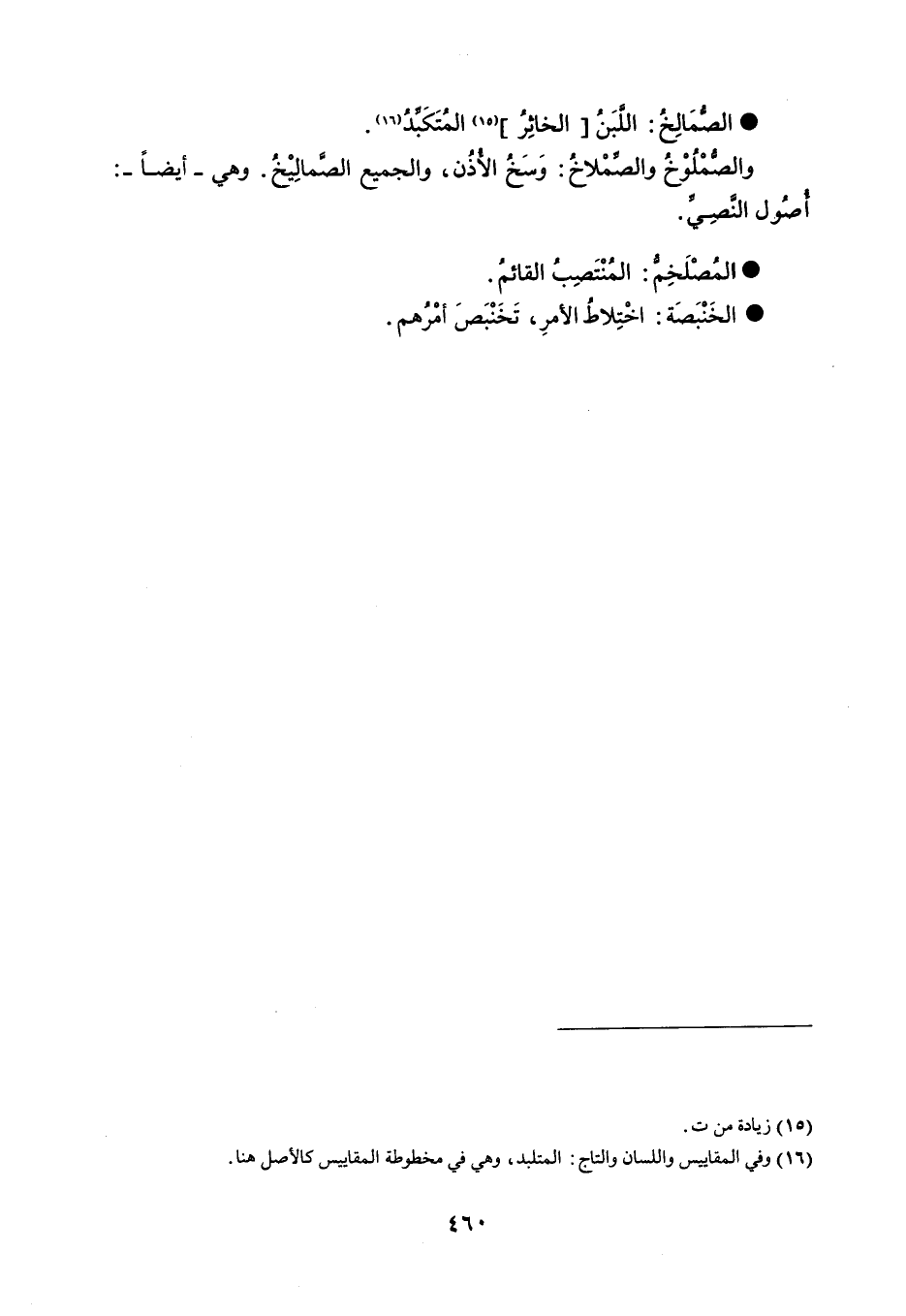 الصُّمَالِخُ اللبَنُ الخاثِرُ المُتَكبد . والصمْلُوْخُ والصمْلاخُ وَسَخُ الأذُن ، والجميع الصمالِيْخُ . وهي - أيضاً - أصُول النَّصِي . المُصْلَخِمُ المُنْتَصِبُ القائمُ . الخَنْبَصَة اخْتِلاطُ الأمرِ ، تَخَنْبَصَ أمْرُهم .