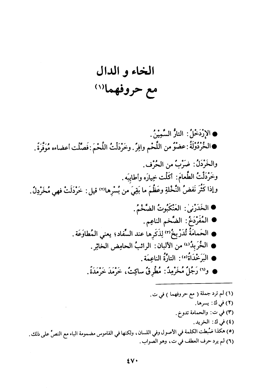 الإِرْدَخْلُ التارُّ السمِيْنُ . الخُرْدُوْلَةُ عضْوٌ من اللَّحْم وافِرٌ . وخَرْدَلْتُ اللَحْمَ فَصَّلْت أعضاءه مُوَفرَةً . والخَرْدَلُ ضَرْبٌ من الحُرْف . وخَرْدَلتُ الطعامَ أكَلْت خِيارَه وأطايِبَه . وإذا كَثُرَ نَفضُ النخْلةِ وعَظُمَ ما بَقِيَ من بُسْرِها قيل خَرْدَلَتْ فهي مُخَرْدِلٌ . الخَدَرْنى العَنْكَبُوتُ الضخْمُ . المُفَرْدَخُ الضَّخم الناعِم . الحَمامَة تدَرْبخُ لِذَكَرِها عند السفاد ؟ يعني المُطاوَعَة . الخُرَبِدُ من الألبان الرائبُ الحامِض الخاثِر . البَرَخْدَاةُ التارةُ الناعِمَة . ورَجُل مُخَرْمِدٌ مطْرقٌ ساكت ، خَرْمَدَ خَرْمَدَةً .