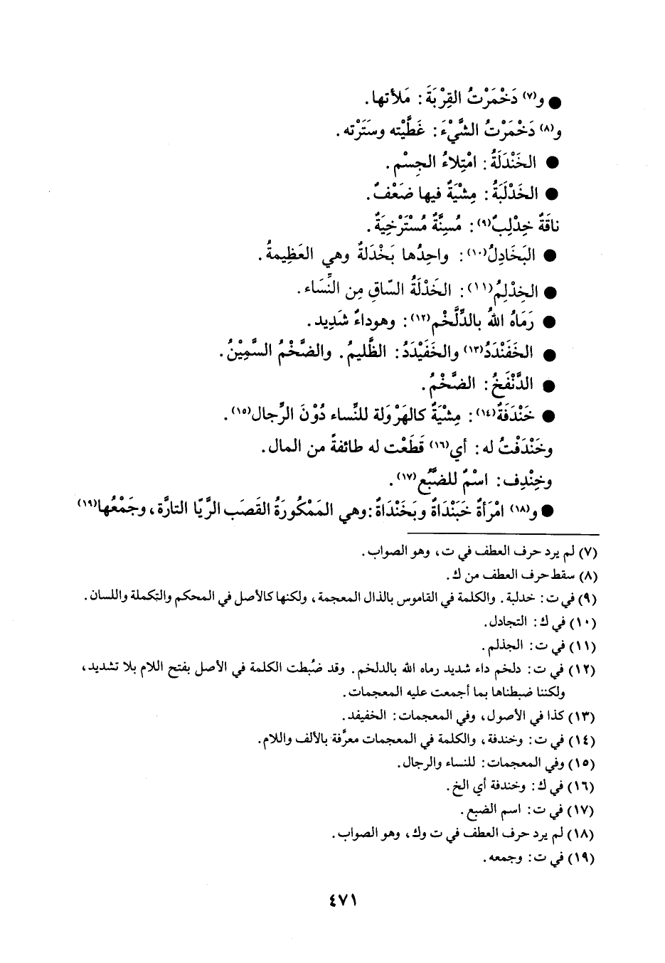 ودَخْمَرْتُ القِرْبَةَ مَلأتها . ودَخْمَرْتُ الشَيْءَ غطيْته وسَتَرْته . الخَنْدَلَةُ امْتِلاءُ الجِسْم . الخَدْلَبَةُ مِشْيَةٌ فيها ضَعْفٌ . ناقَةٌ خِدْلِبٌ مُسِنَّةٌ مُسْتَرْخِيَةٌ . البَخَادِل واحِدُها بَخْدَلةٌ وهي العَظِيمةُ . الخِدْلِمُ الخَدْلَةُ السّاقِ مِن النَسَاء . رَمَاهُ اللهُ بالدلخْم وهو داء شَدِيد . الخَفَنْدَدُ والخَفَيْدَدُ الظليمُ . والضخْمُ السمِيْنُ . الدنْفِخُ الضخْمُ . خَنْدَفة مِشْيَة كالهَرْوَلة للنساء دوْنَ الرجال . وخَنْدَفْتُ له أي قَطَعْت له طائفةً من المال . وخِنْدِف اسْمٌ للضبع . وامْرَأة خَبَنْدَاة وبَخَنْدَاةٌ وهي المَمْكُورَةُ القَصَب الريّا التارة ، وجَمْعُها