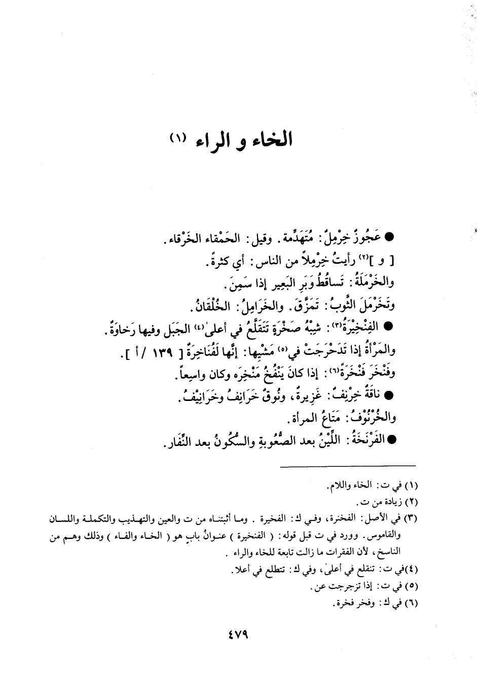 عَجُوزٌ خِرْمِلٌ مُتَهدِّمة . وقيل الحَمْقاء الخَرْقاء . ' و ' رأيتُ خِرْمِلاً من الناس : أي كثرةً . والخَرْمَلَةُ : تَساقُطُ وَبَرِ البَعِير إذا سَمِنَ . وتَخَرْمَلَ الثوبُ : تَمَزَقَ . والخَرَامِلُ : الخُلْقَانُ . الفِنْخِيْرَةُ شِبْة صَخْرَةٍ تَتَقَلَّعُ في أعلى الجَبَل وفيها رَخاوَةٌ . والمَرْأةُ إذا تَدَحْرَجَتْ في مَشْيِها إنَها لَفُنَاخِرَةٌ . وفَنْخَرَ فَنْخَرَةً : إذا كانَ يَنْفُخُ مَنْخِرَه وكان واسِعاً . ناقَةٌ خِرْنِفٌ غَزِيرةٌ ، ونُوقٌ خَرَانِفُ وخَرَانِيْفُ . والخُرْنُوْفُ : مَتَاعُ المرأة . الفَرْنَخَةُ اللِّيْنُ بعد الصُّعُوبةِ والسُّكُونُ بعد النَفَار .