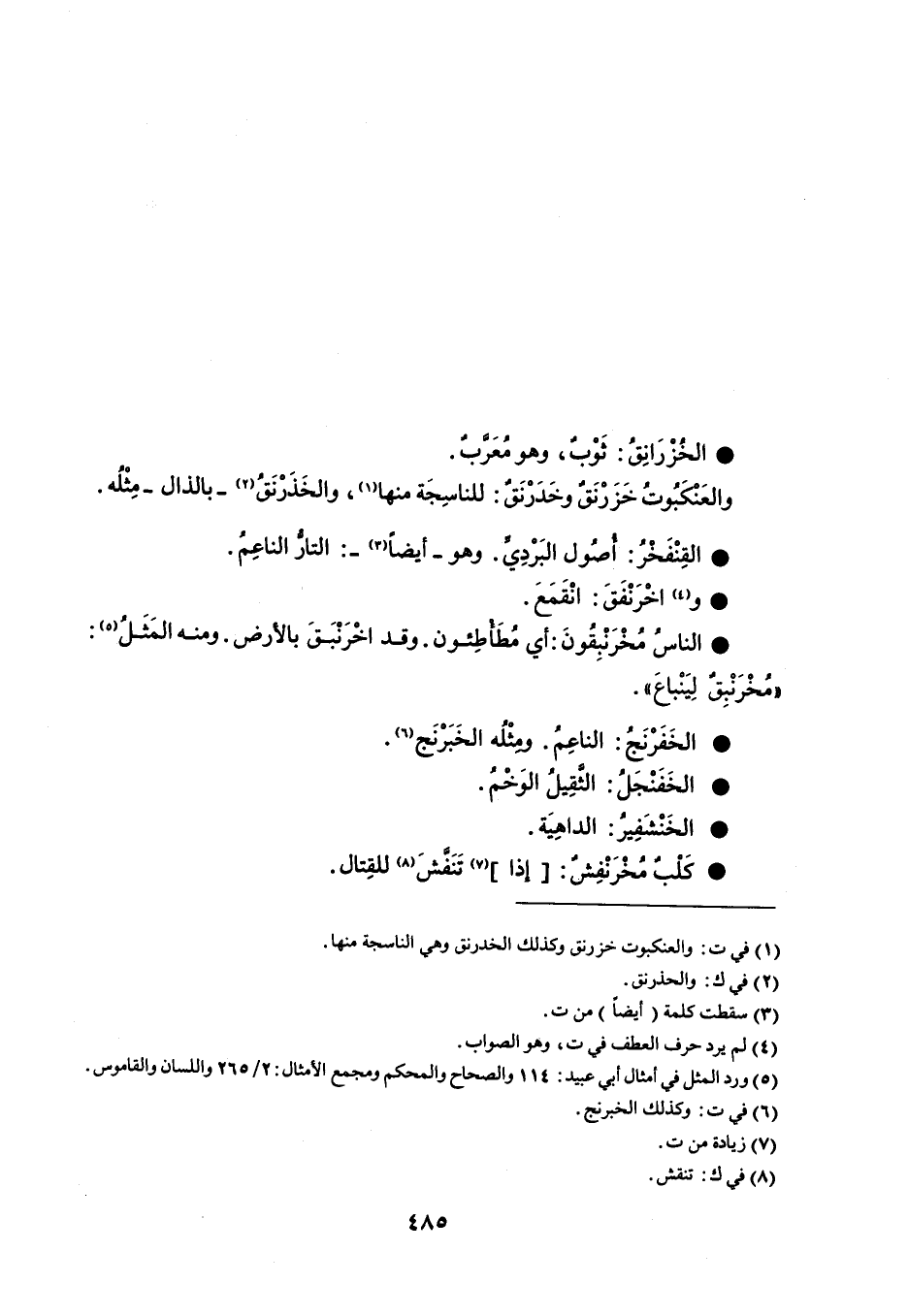 الخُزْرَانِقُ ثَوْبٌ ، وهو مُعَرَّبٌ . والعَنكَبُوتُ خَزَرْنَقٌ وخَدَرْنَقٌ : للناسِجَة منها ، والخَذَرْنَقُ - بالذ ال - مِثْلُه . القِنْفَخْرُ أصُول البَرْدِيِّ . وهو - أيضاً - التارُّ الناعِمُ . واخْرَنْفَقَ : انْقَمَعَ . الناسُ مُخْرَنْبِقُونَ أي مُطَأطِئون . وقد اخْرَنْبَقَ بالأرض . ومنه المَثَلُ ' مُخْرَنْبِقٌ لِيَنْباعَ ' . الخَفَرْنَجُ الناعِمُ . ومِثْلُه الخَبَرْنَج . الخَفَنْجَلُ الثقِيلُ الوَخْمُ . الخَنْشَفِيرُ الداهِيَة . كَلْبٌ مُخْرَنْفِشن ' إذا ' تَنَفَّشَ للقِتال .