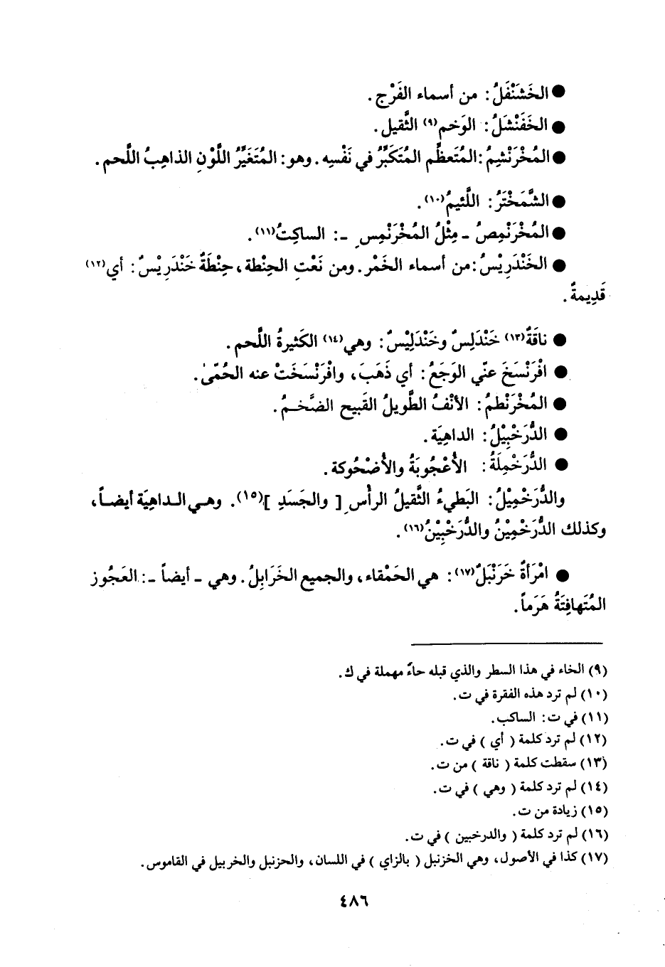 الخَشَنْفَلُ من أسماء الفَرْج . الخَفَنْشَلُ الوَخم الثقيل . المُخْرَنْشِمُ المُتَعظِّم المُتَكَبِّرُ فى نَفْسِه . وهو المُتَغَيِّرُ اللَّوْنِ الذاهِبُ اللَّحم . الشَّمَخْتَرُ اللَّئيمُ . المُخْرَنْمِصُ - مِثْلُ المُخْرَنْمِسِ - الساكِتُ . الخَنْدَرِيْسُ من أسماء الخَمْر . ومن نَعْتِ الحِنْطة ، حِنْطَة خَنْدَرِيْسٌ أي قَدِيمةٌ . ناقَةٌ خَنْدَلِسٌ وخَنْدَلِيْسٌ وهي ، الكَثيرةُ اللَّحم . افْرَنْسَخَ عنّي الوَجَعُ أي ذَهَبَ ، وافْرَنْسَخَتْ عنه الحُمّى . المُخْرَنْطمُ الأنْفُ الطَّويلُ القَبيح الضَّخمُ . الدُّرَخْبِيْلُ الداهِيَة . الدُّرَخْمِلَةُ الأُعْجُوبَةُ والأُضْحُوكة . والدُّرَخْمِيْلُ : البَطيءُ الثقيلُ الرأسِ والجَسَدِ . وهي الداهِيَة أيضاً ، وكذلك الدُّرَخْمِيْنُ والدُّْرَخْبِيْنُ . امْرَأة خَرَنْبَلٌ هي الحَمْقاء ، والجميع الخَرَابِلُ . وهي - أيضاً - العَجُوز المُتَهافِتَةُ هَرَماً .