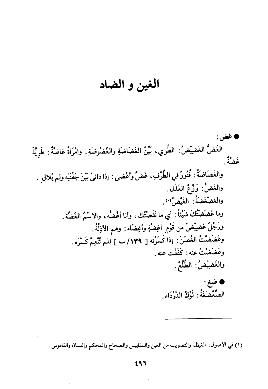 غض الغَضُّ الغَضِيْضُ : الطَّري ، بَيِّنُ الغَضَاضَةِ والغُضُوضَةِ . وامْرَأةٌ غاضَّةٌ : طَرِيَّةٌ غَضَّةٌ . والغَضَاضَةُ : فُتُورٌ في الطَّرْفِ ، غَضَّ وأغْضى : إذا دانى بَيْنَ جَفْنَيْه ولم يُلاقِ . والغَضُّ : وَزْعُ العَذْل . والغَضْغَضَةُ : الغَيْضُ . وما غَضَضْتُكَ شَيْئاً : أي ما نَقَصْتُك ، وأنا أغُضُّه ، والاسْمُ الغُضَّة . ورَجُلٌ غَضِيْضٌ من قَوْمٍ أغِضَّةٍ وأغِضّاء : وهم الأذِلَّةُ . وغَضَضْتُ الغُصْنَ : إذا كَسَرْتَه ، فلم تُنْعِمْ كَسْرَه . وغَضَضْتُ عنه : كَفَفْت عنه . والغَضِيْضُ : الطَّلْعُ . ضغ الضَّغْضَغَةُ : لَوْكُ الدَّرْدَاء .